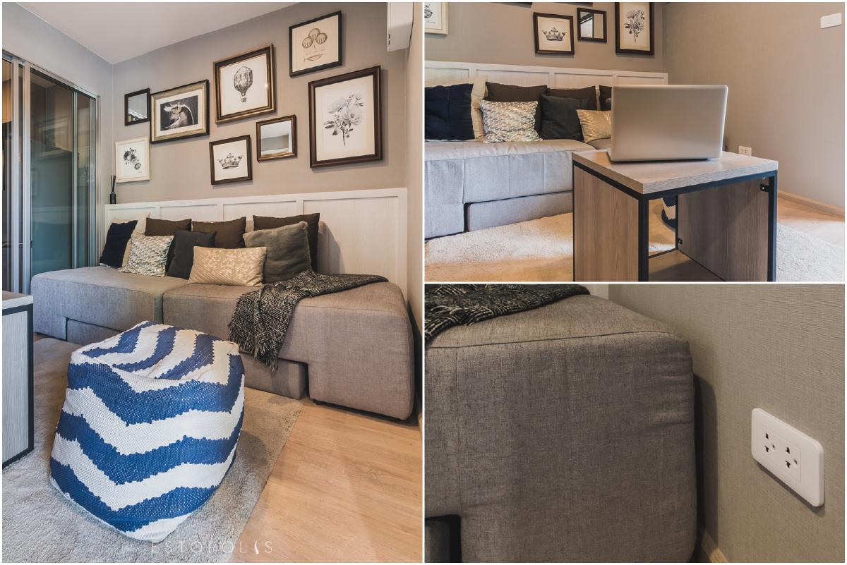 สำหรับห้อง 1 Bedroom ทาง Elio Del Moss (เอลลิโอ เดล มอสส์ พหลโยธิน 34) ให้โซฟา 1 ตัว ที่สามารถปรับเปลี่ยนรูปแบบเป็น sofa bed ได้ เผื่อวันไหนมีเพื่อนมาพักที่ห้อง สามารถใช้งานได้หลายฟังก์ชันทั้งนั่งและนอน ด้านข้างมีปล๊กไฟ 1 จุด เผื่อผู้พักอาศัยคนใดอยากชาร์จแบตโทรศัพท์มือถือ หรือ เสียบโน๊ตบุ๊คส์นั่งทำงาน