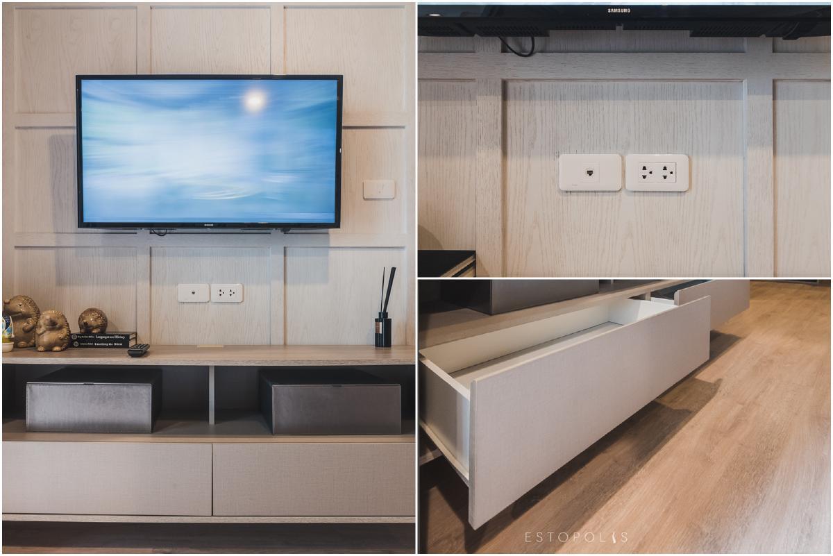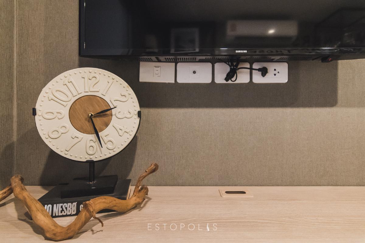 ไม่ต้องเสียเวลาหาชั้นวางโทรทัศน์ เพราะทาง Elio Del Moss (เอลลิโอ เดล มอสส์ พหลโยธิน 34) ได้บิ้วอินท์ชั้นวางเมลามีนลายไม้มาให้เรียบร้อย ด้านล่างเป็นลิ้นชักเลื่อนเก็บสะดวก พร้อมจุดติดตั้งสัญญาณเคเบิล TV และแนะนำให้ติดโทรทัศน์แบบแขวนผนังเช่นเดียวกับในห้องตัวอย่าง เพื่อเพิ่มพื้นที่ให้วางของได้เยอะขึ้น