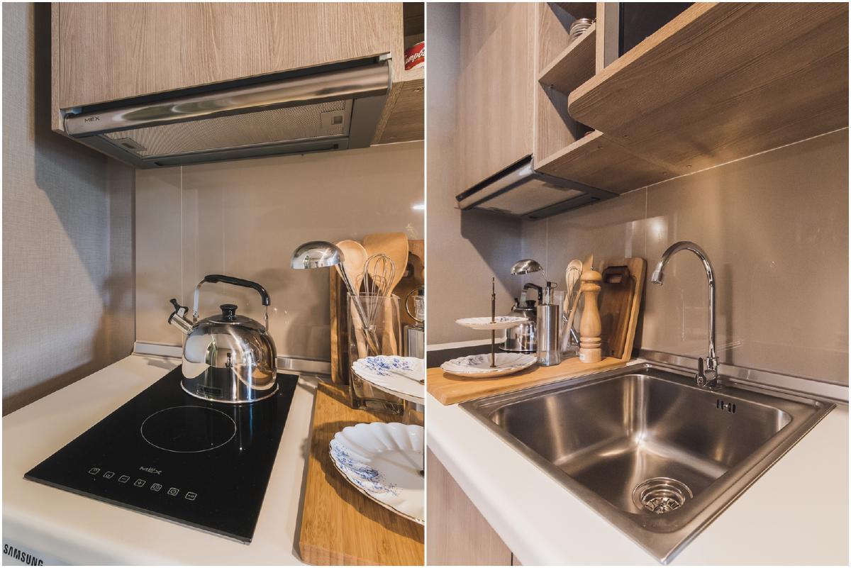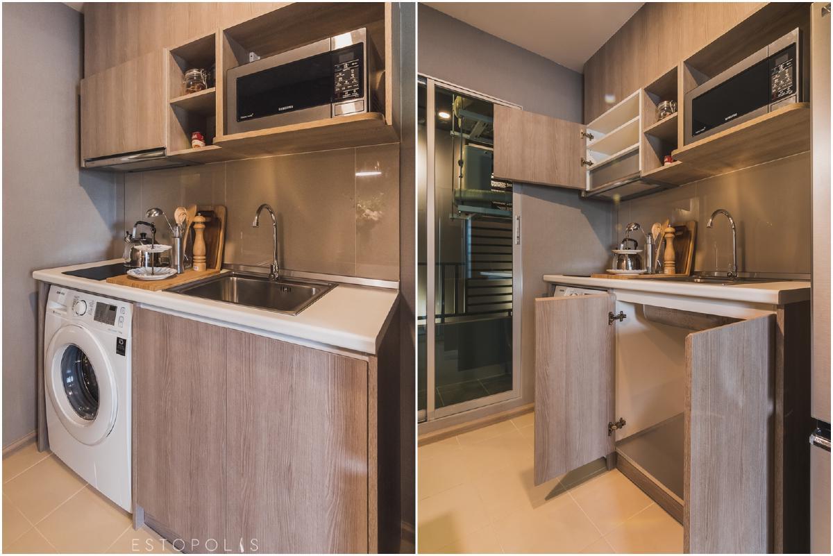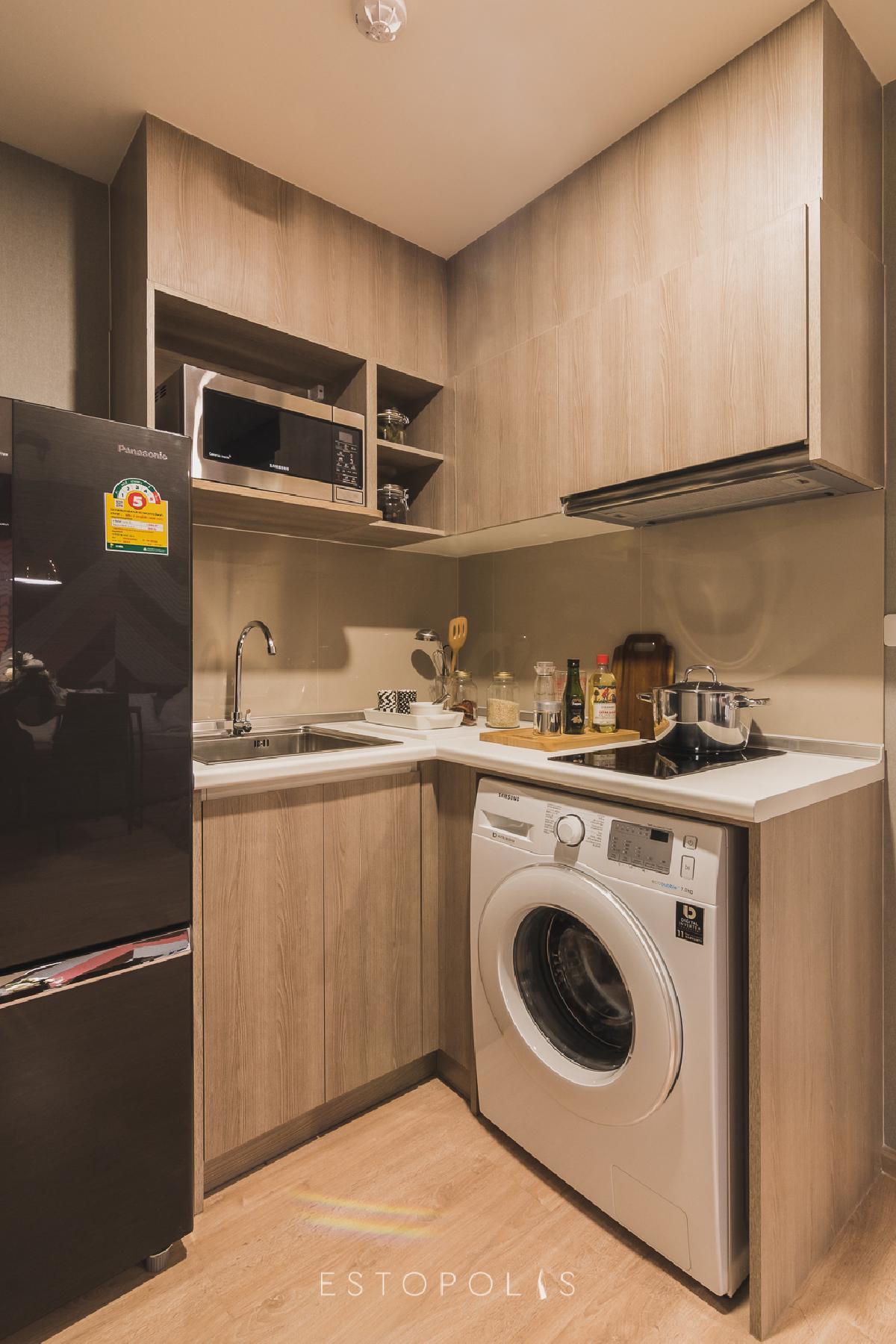 ชุดครัวแบบครบชุด มีพื้นที่เตรียมอาหารและพื้นที่เก็บอุปกรณ์พร้อม โดยชั้นบนจะเป็นชั้นสำหรับเก็บข้าวของเครื่องใช้ มีช่องใส่ไมโครเวฟอยู่ข้างๆ เวลาอุ่นอาหารควรระวัง ส่วนเคาน์เตอร์ด้านล่างเป็นตู้ใต้ซิงค์ ใช้เก็บของชิ้นใหญ่ และช่องสำหรับใส่เครื่องซักผ้าขนาด 7 กิโลกรัม เพื่องานซักล้าง