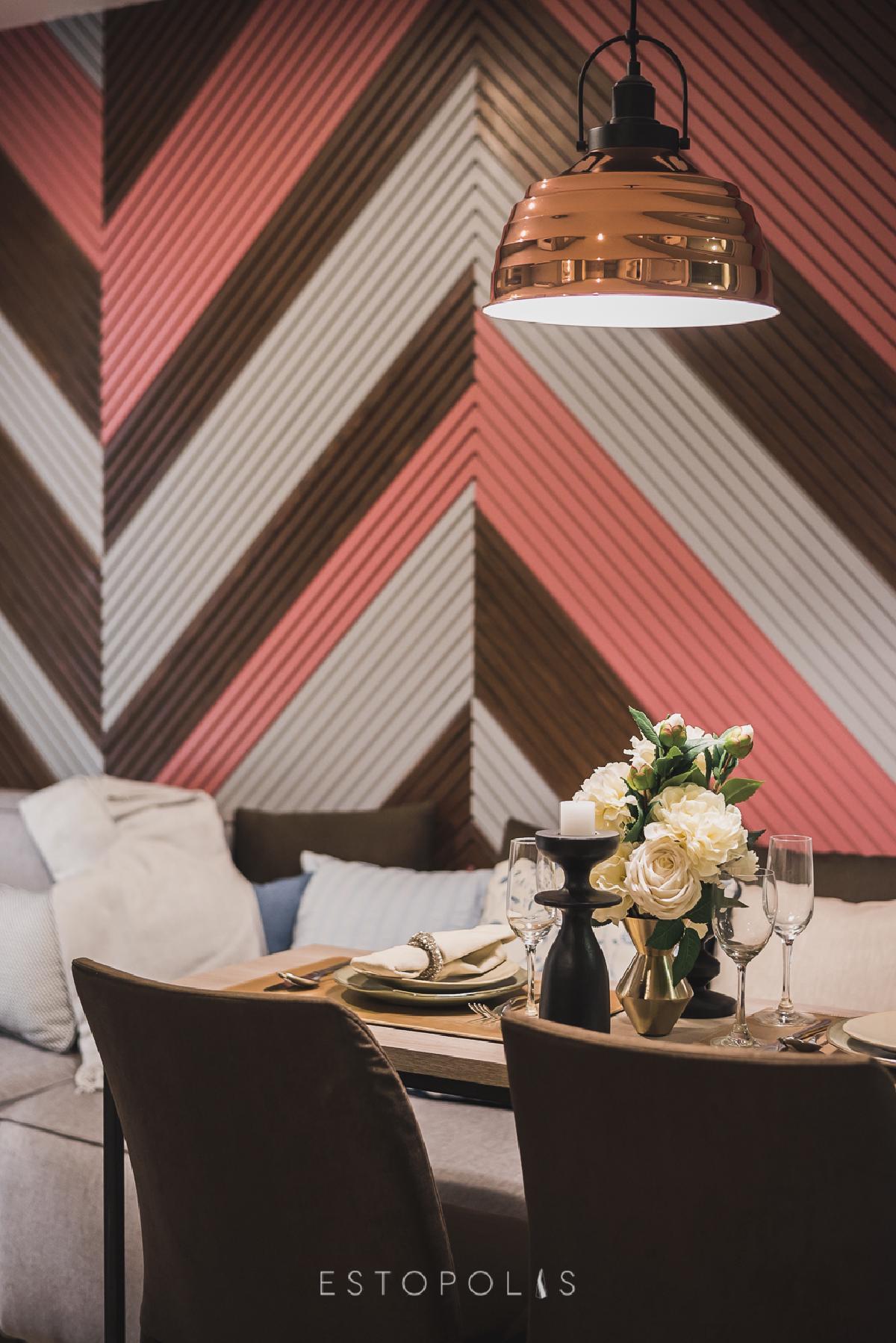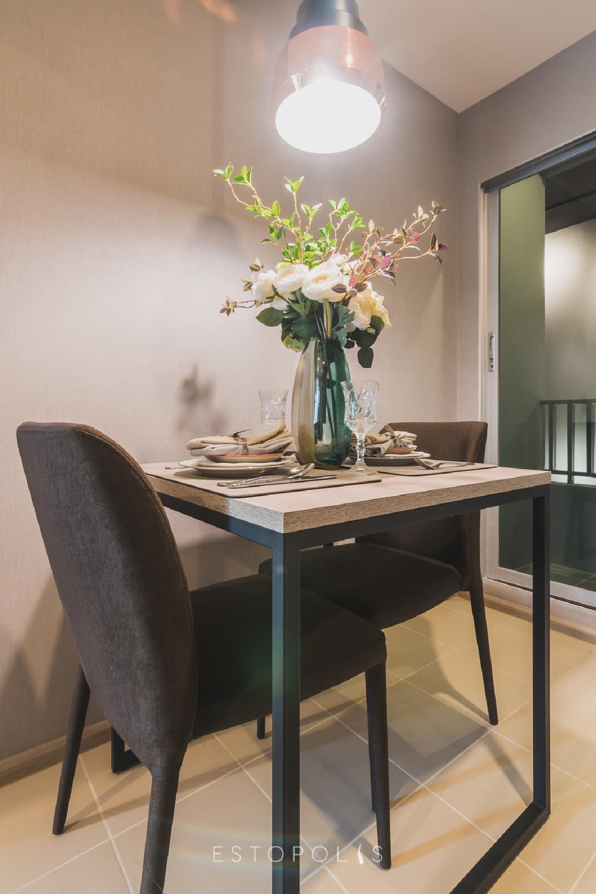 โต๊ะทานข้าวพร้อมเก้าอี้ 2 ตัว ถูกจัดไว้อยู่มุมโซฟา ทำให้สามารถนั่งเพิ่มได้เป็น 4 คน ซึ่งการใช้เฟอร์นิเจอร์แบบโชว์ขา ลักษณะโปร่งแบบนี้จะช่วยให้ห้องดูปลอดโปร่ง ไม่อึดอัดสายตา