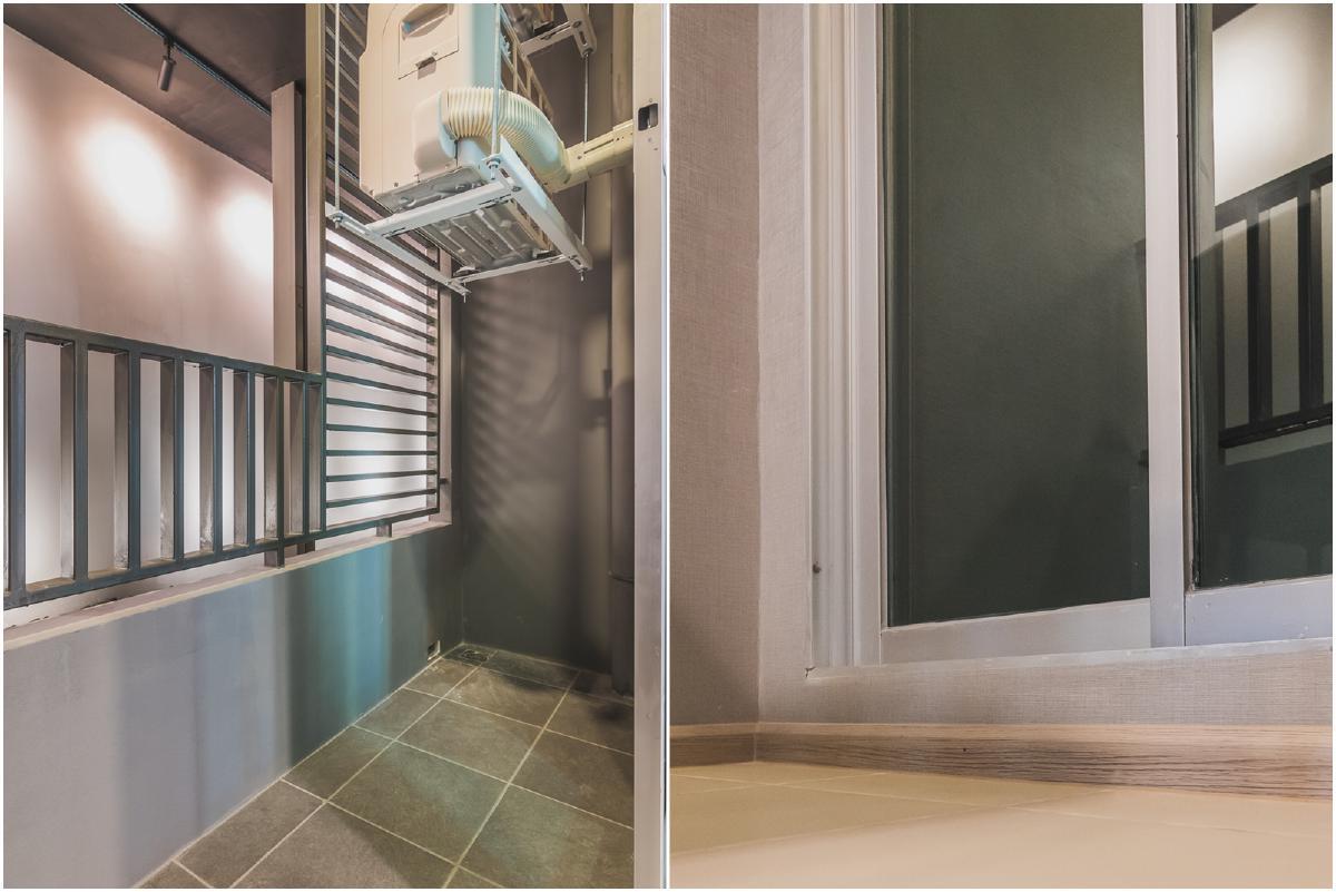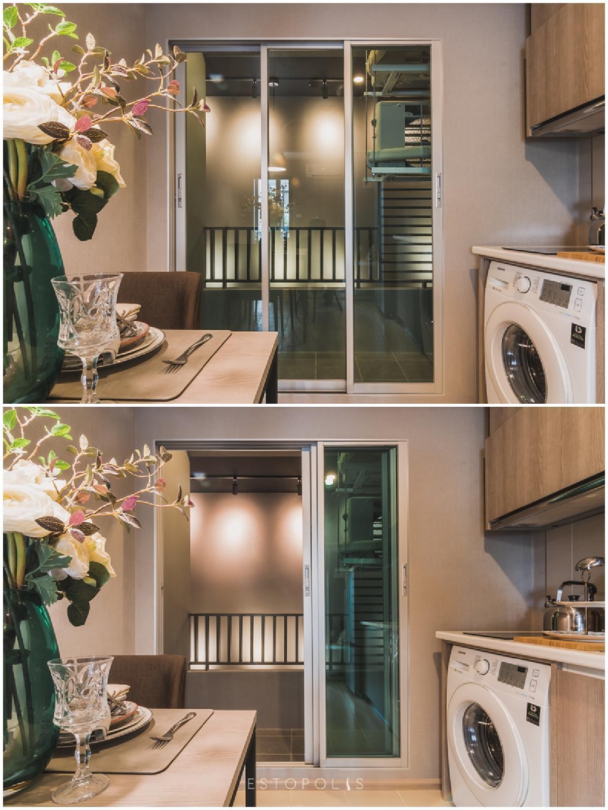 ห้องครัวเชื่อมกับระเบียงด้านนอก ประตูบานเลื่อนแบบ 3 ตอน ทำให้เปิดออกได้กว้างกว่า ไม่แกะกะทางเดิน กระจกที่ใช้ติดตั้งเป็นกระจกแบบตัดแสง ช่วยกันความร้อน
