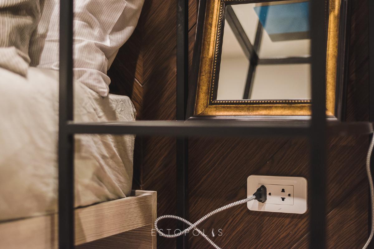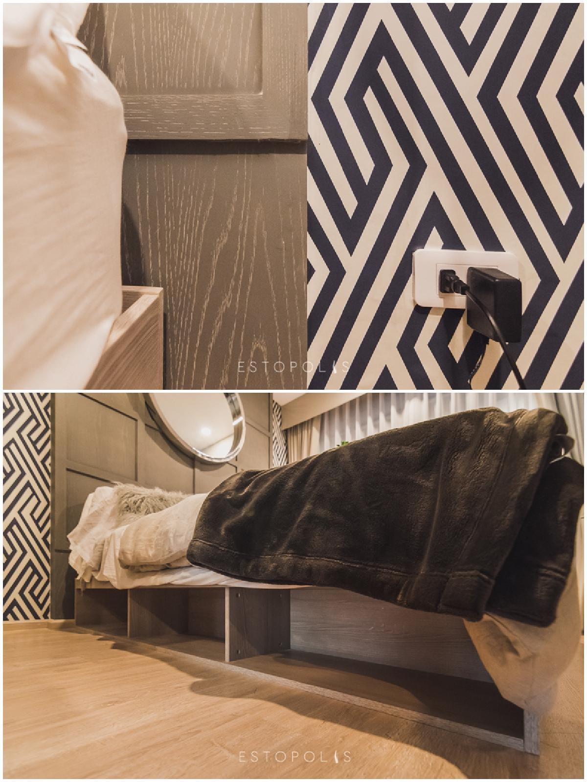 ฝั่งขวามือของเตียงมีปลั๊กไฟ 1 จุด หากใครต้องการตั้งโคมไฟ หรือใช้ชาร์จแบตมือถือก็สะดวกสบาย นอกากนี้เตียงของ Elio Del Moss (เอลลิโอ เดล มอสส์ พหลโยธิน 34) ยังเพิ่มประโยชน์ใช้สอย ด้วยการดีไซน์ช่องเก็บของไว้ตรงฐานเตียง