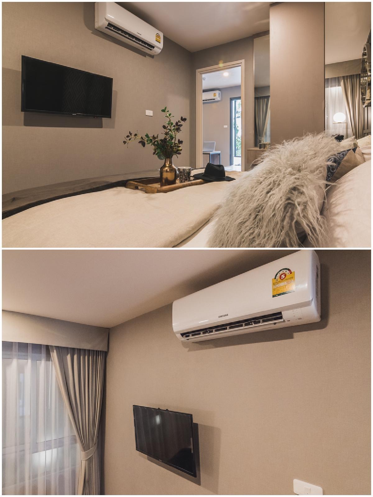 ปลายเตียงติดเครื่องปรับอากาศขนาด 9,000 BTU ของ Sumsung หรือเทียบเท่าเช่นเดียวกับห้องรับแขกด้านนอก และเหลือพื้นที่ด้านล่างสำหรับติดโทรทัศน์แขวนผนัง