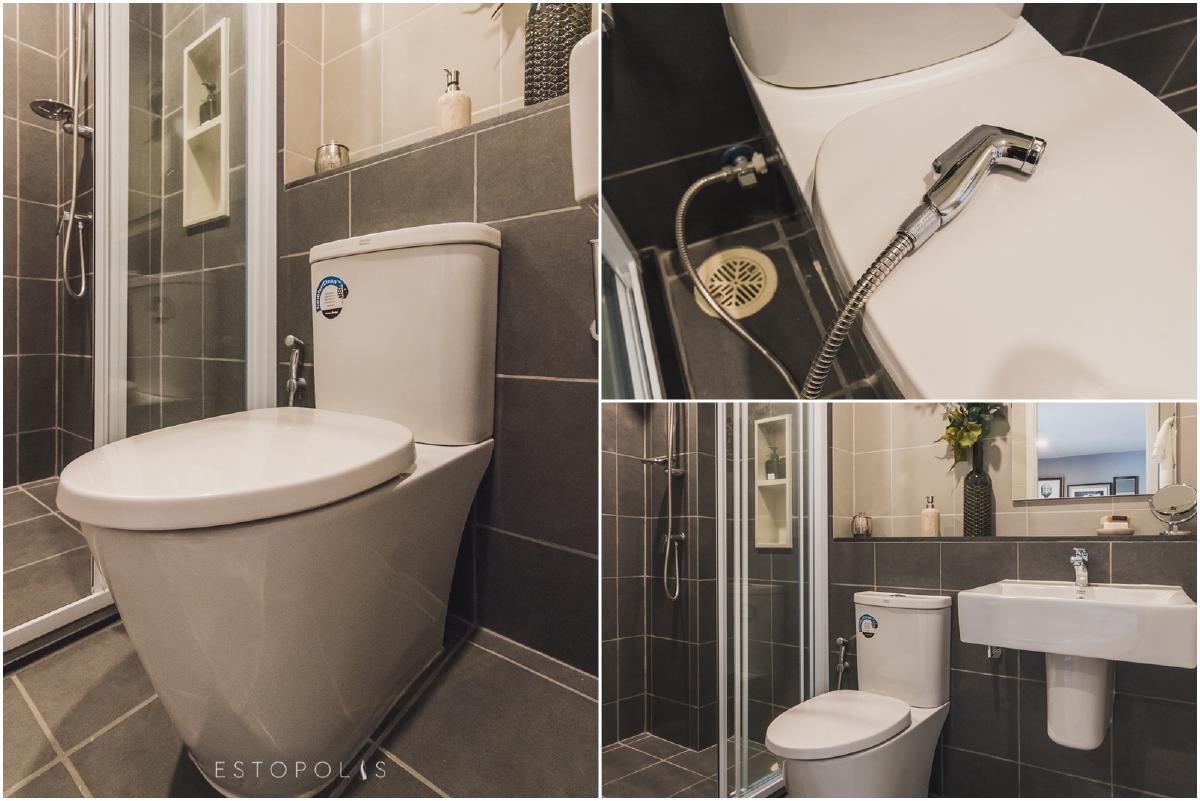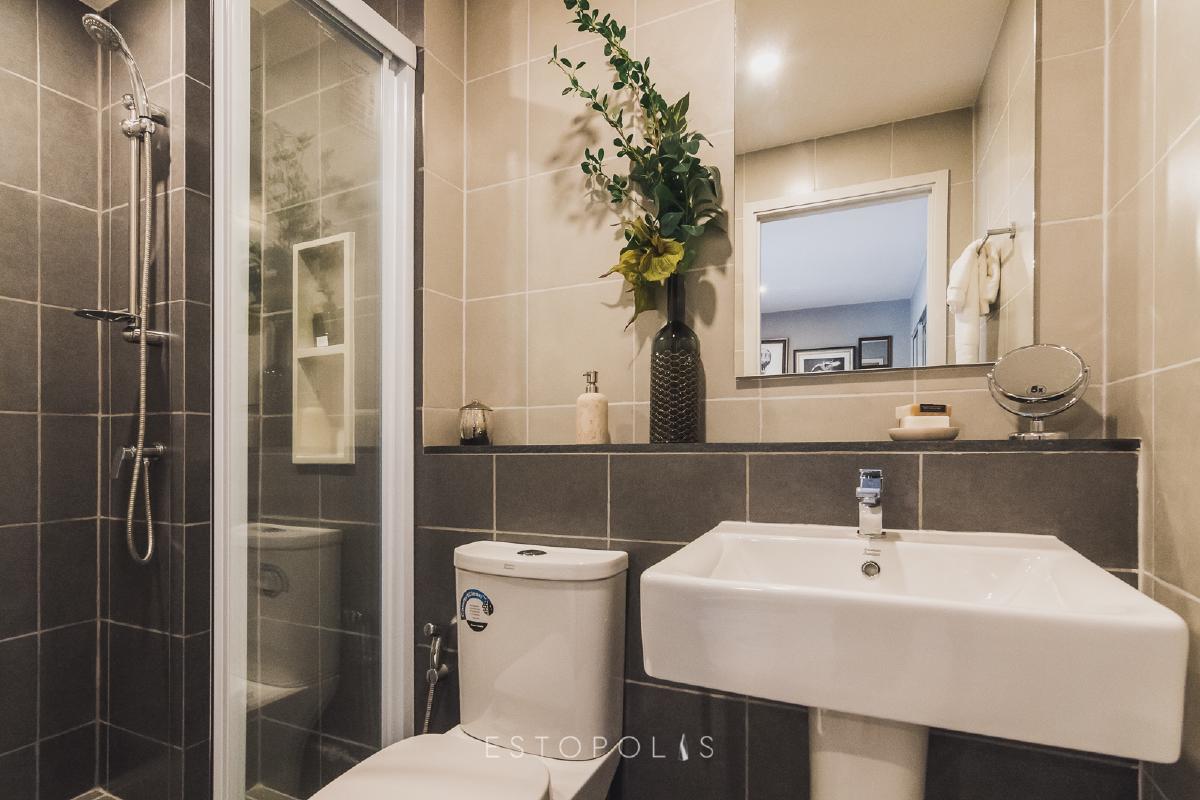 รูปแบบและหน้าตาของห้องน้ำจะเหมือนกันทั้งโครงการ คือ แบ่งโซนแห้งและโซนเปียกออกจากกันด้วยแพลทติชั่นบานเลื่อนกระจกแบบ 3 ตอน สุขภัณฑ์ห้องน้ำเป็นของ American Stan Standard ครบชุด ได้แก่ อ่างล้างหน้า , โถสุขภัณฑ์ และอุปกรณ์อาบน้ำ พื้นและผนังปูกระเบื้องเซรามิค มีการ Drop wall ให้วางของใช้เพิ่มได้