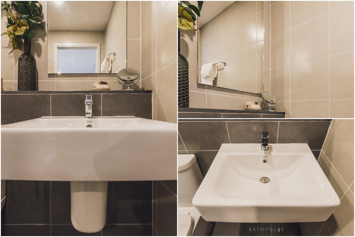 อ่างล้างหน้าจาก American Standard ถูกติดตั้งแบบขาลาย มีที่หน้าอ่างให้วางของได้เล็กน้อย โดยทาง Elio Del Moss (เอลลิโอ เดล มอสส์ พหลโยธิน 34) ได้ออกแบบ Drop wall ขึ้นมาให้วางของเพิ่มเติมได้เยอะขึ้น