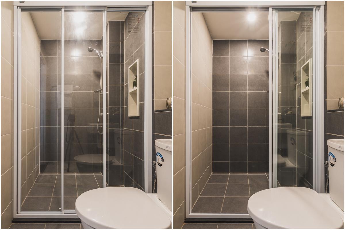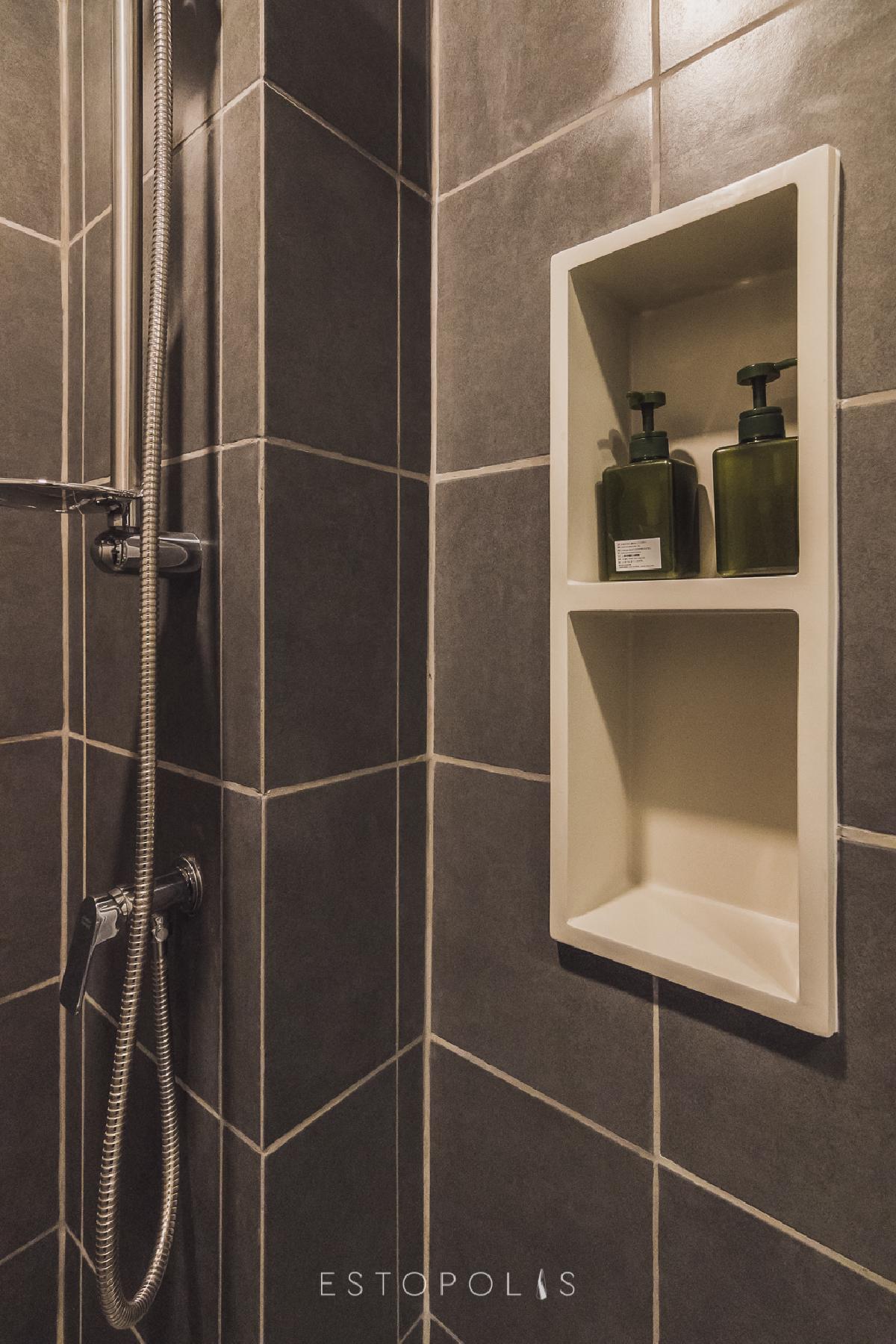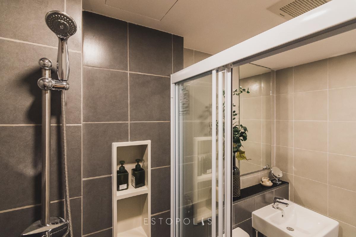 โซนห้องอาบน้ำ ออกแบบไว้พร้อมใช้งาน มีชุดฝักบัวและชั้นวางของให้