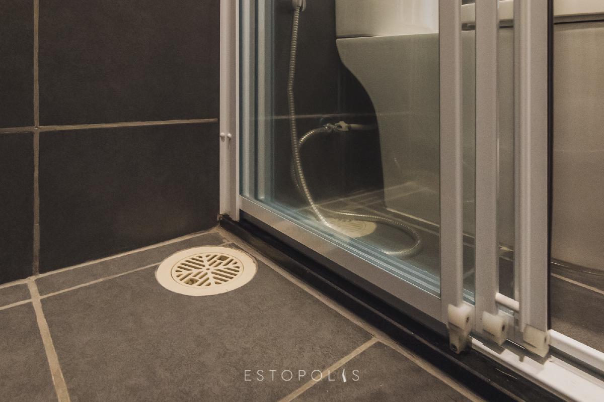 ท่อระบายน้ำอยู่ตรงมุมห้องอาบน้ำด้านนอก ป้องกันน้ำไหลออกไปยังโซนแห้ง