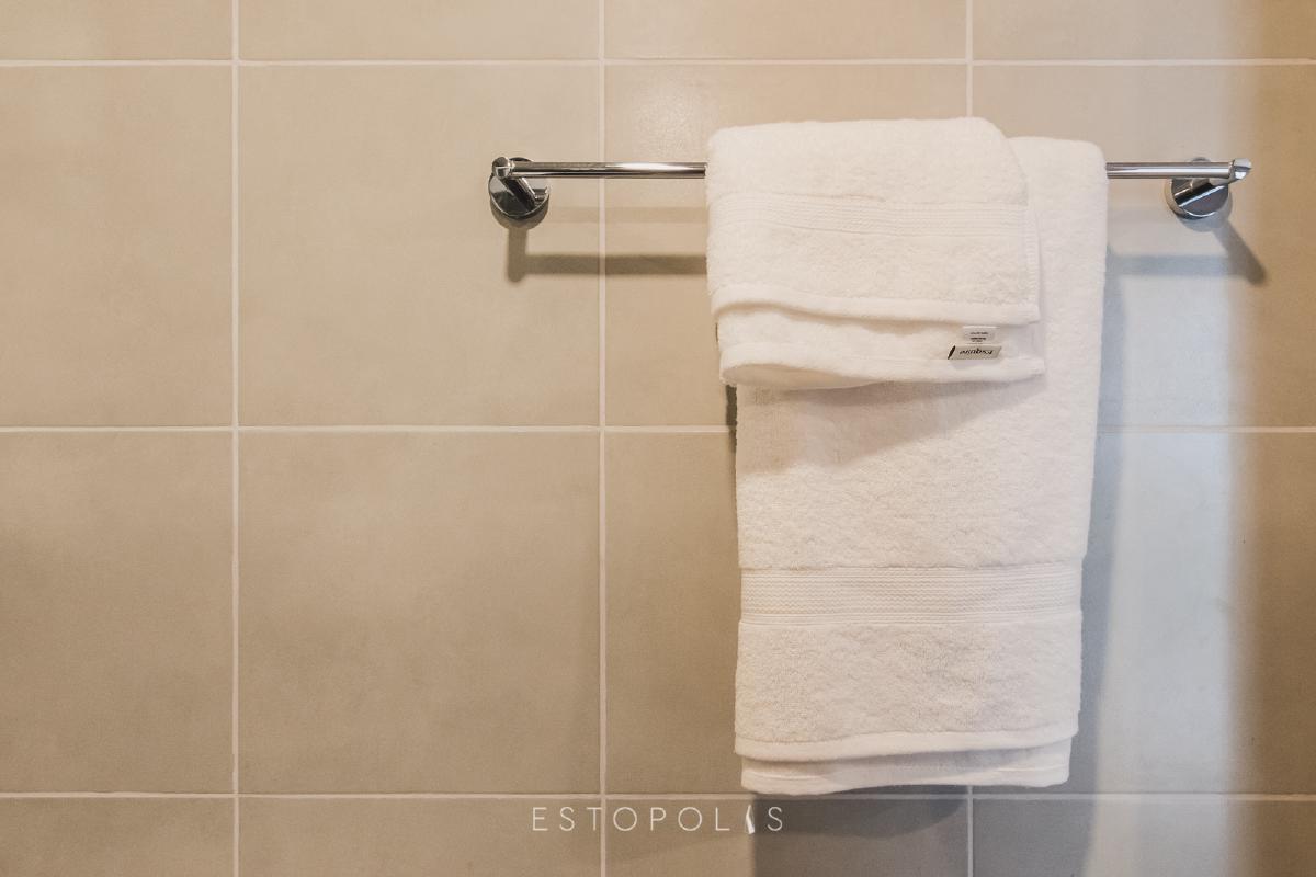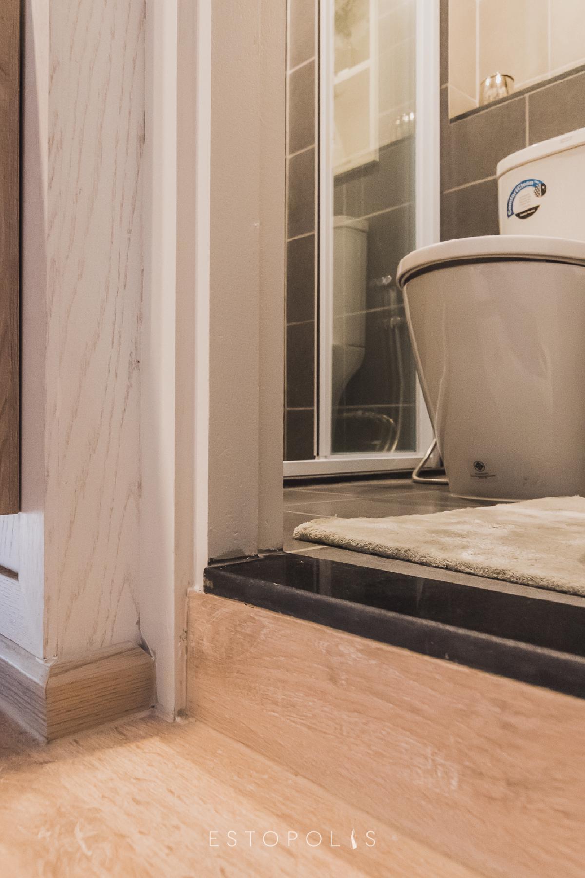 ทางเข้าห้องน้ำอยู่ทางอยู่ขวามือ มีการยกพื้นสูงขึ้นจากระดับพื้นห้องปกติ 4.5 นิ้ว แนะนำให้วางพรมเช็ดเท้าไว้บริเวณหน้าห้อง เพื่อป้องกันพื้นเปียก