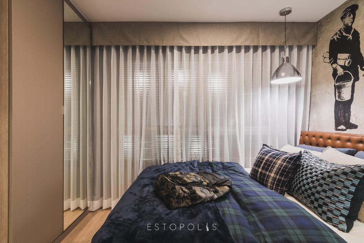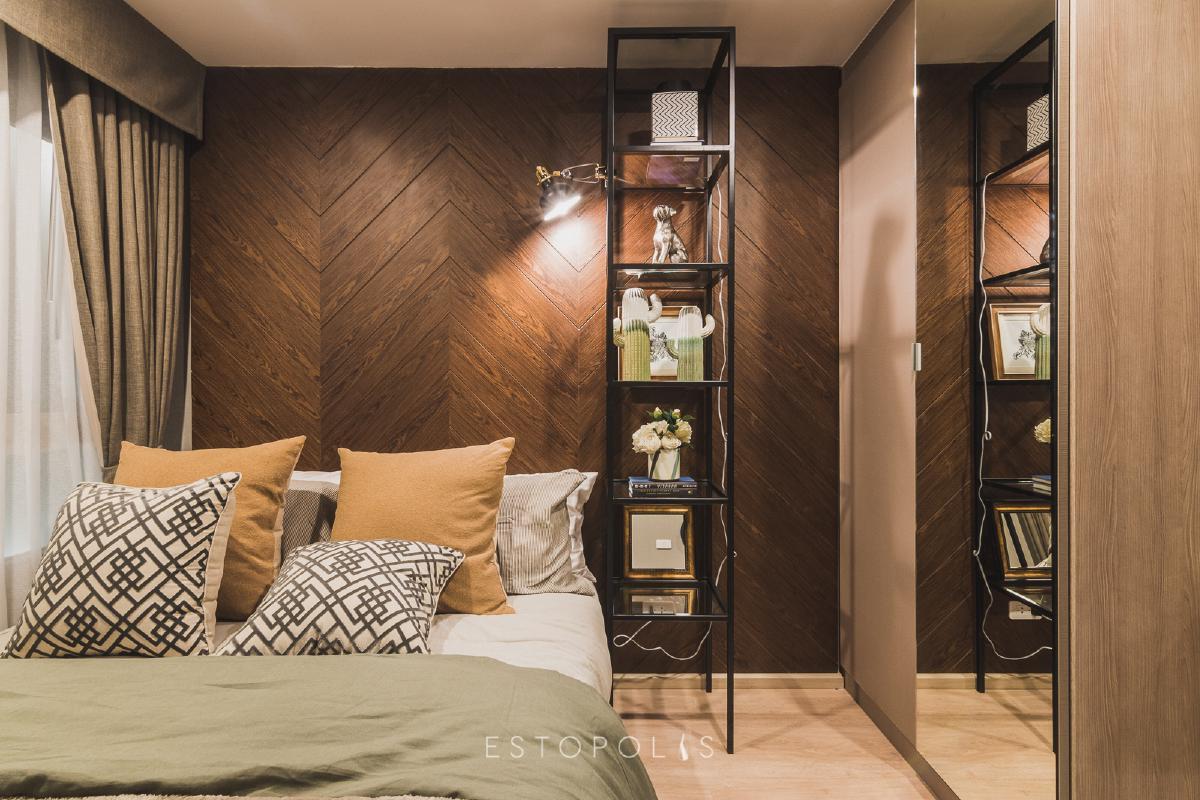 การตกแต่งห้องนอน ของ Elio Del Moss (เอลลิโอ เดล มอสส์ พหลโยธิน 34) จะให้บรรยากาศอบอุ่นเหมาะแก่การนอน ไม่สว่างจนเกินไป เน้นความเรีบง่ายโทนสีน้ำตาลอมส้มของเมลามีนลายไม้ แล้วค่อยเพิ่มความโดดเด่นด้วยวอลล์เปเปอร์ลายกราฟิกบริเวณหัวเตียง