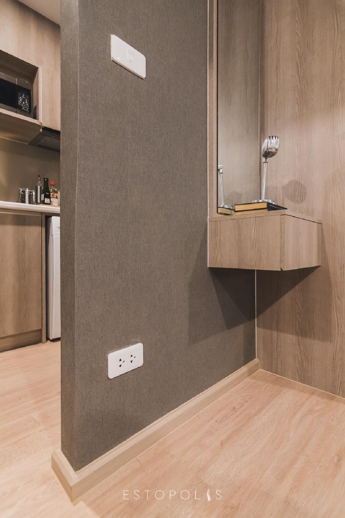 บิ้วท์อินโต๊ะเครื่องแป้งเมลามีนลายไม้ไว้ข้างๆ ด้านล่างทำเป็นลิ้นชักเก็บของไปในตัว และมีปลั๊กให้เพื่อการใช้งานไดร์เป่าผม