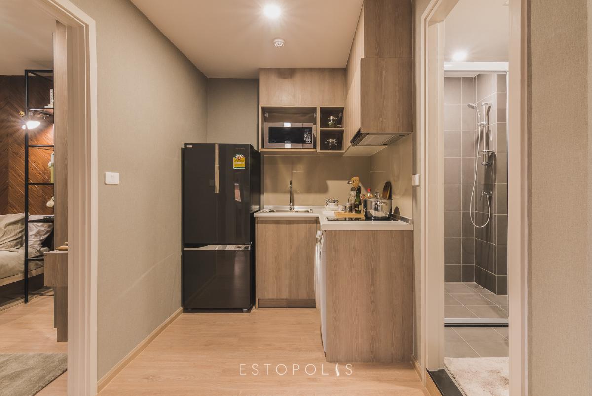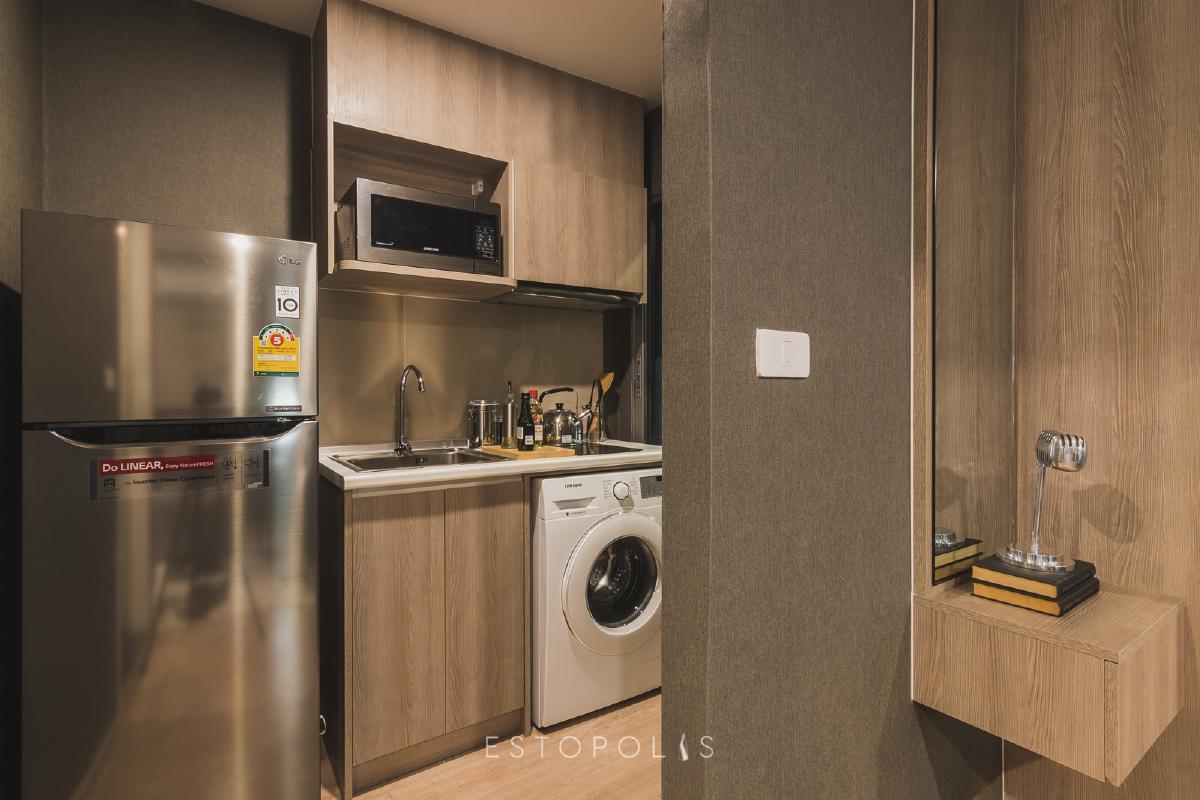 ห้องครัวขนาดกระทัดรัด เหมาะสำหรับการประกอบอาหารมื้อเล็กๆ ไม่ยุ่งยาก โดย Elio Del Moss (เอลลิโอ เดล มอสส์ พหลโยธิน 34) ได้ Built in ชุดครัวเมลามีนลายไม้ และเตาไฟฟ้าพร้อมเครื่องดูดควันแบบไส้กรองของ MEX มาให้เช่นกัน แต่จะมีขนาดเล็กกว่าห้อง 1 Bedroom เล็กน้อย ด้านข้างเว้นที่ไว้ให้วางตู้เย็นขนาด 9.4 คิวได้สบาย