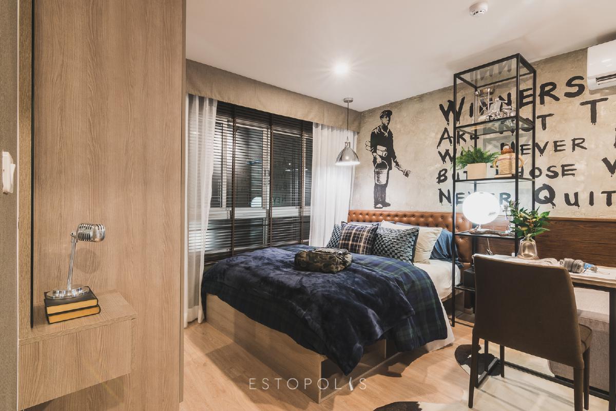 การตกแต่งห้องนอนยังคงความโมเดิร์น เรียบง่าย ไว้อย่างชัดเจน ด้วยรูปแบบเฟอร์นิเจอร์เมลามีนลายไม้ที่ทาง Elio Del Moss (เอลลิโอ เดล มอสส์ พหลโยธิน 34) Built in ให้ มีความกลมกลืนไปในทิศทางเดียวกัน ส่วนริมสุดติดหน้าต่างบานกว้าง ปล่อยให้แสงอาทิตย์ส่องเข้ามาได้ทั่วถึง ช่วยให้ห้อง Studio ที่มีขนาดไม่ใหญ่มาก กว้างขว้างขึ้นได้ง่ายๆ