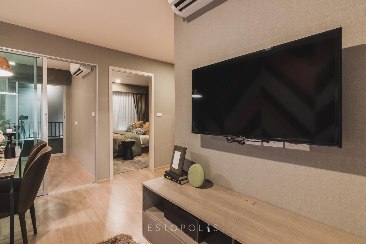 ถึงจะเป็นห้องขนาด 1 ห้องนอน แต่ระยะการรับชมกว้าง 2-3 เมตร ทำให้เราสามารถติดตั้งโทรทัศน์ขนาดใหญ่ได้โดยไม่ทำให้ปวดสายตา หรือวางโต๊ะกลางเสริมเหมือนในห้องตัวอย่างก็ทำได้สบาย