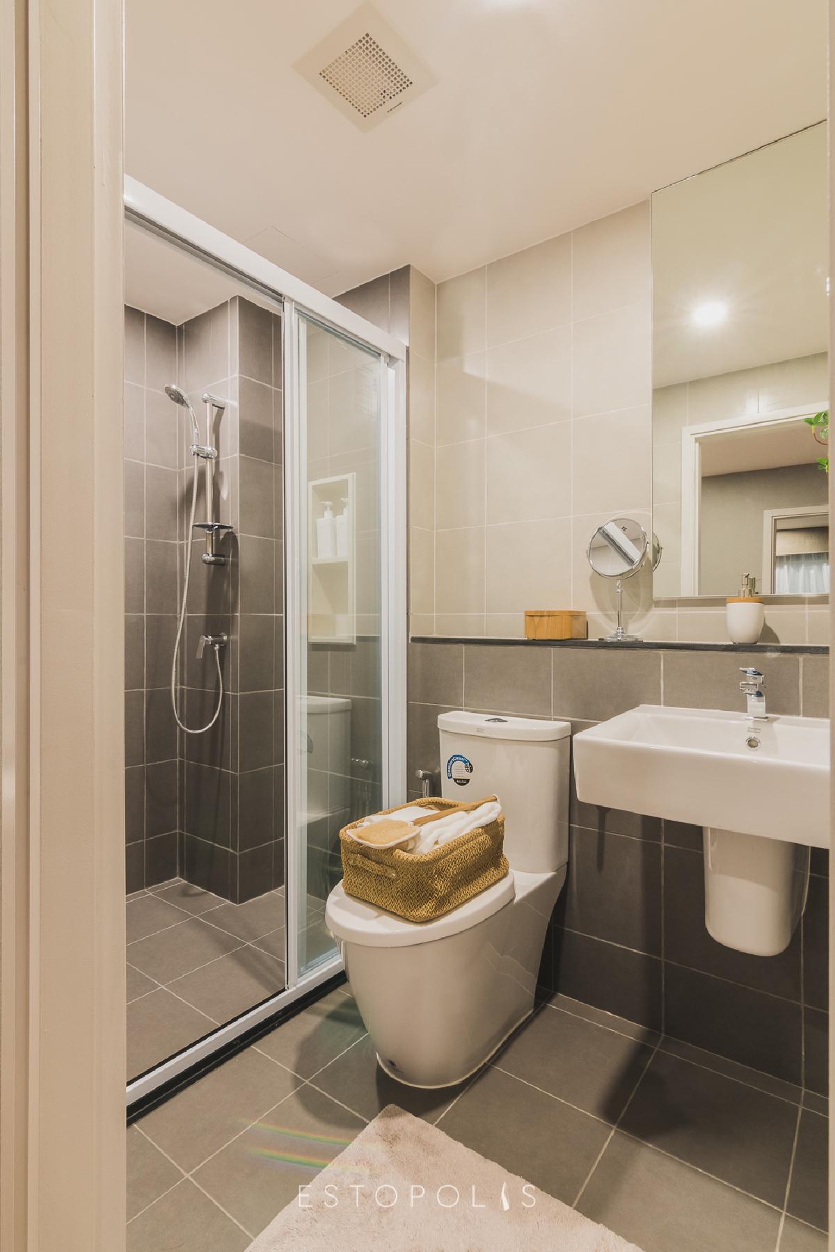 Elio Del Moss (เอลลิโอ เดล มอสส์ พหลโยธิน 34) ตกแต่งห้องน้ำแบบเรียบง่าย แต่ประโยชน์ใช้สอยครบทั้งโซนแห้งและเปียก กั้นด้วยแพลทติชั่นกระจกบานเลื่อน พื้นและผนังปูกระเบื้ยงเซรามิก พร้อมติดตั้งสุขภัณฑ์ของ American Standard ให้ครบชุด