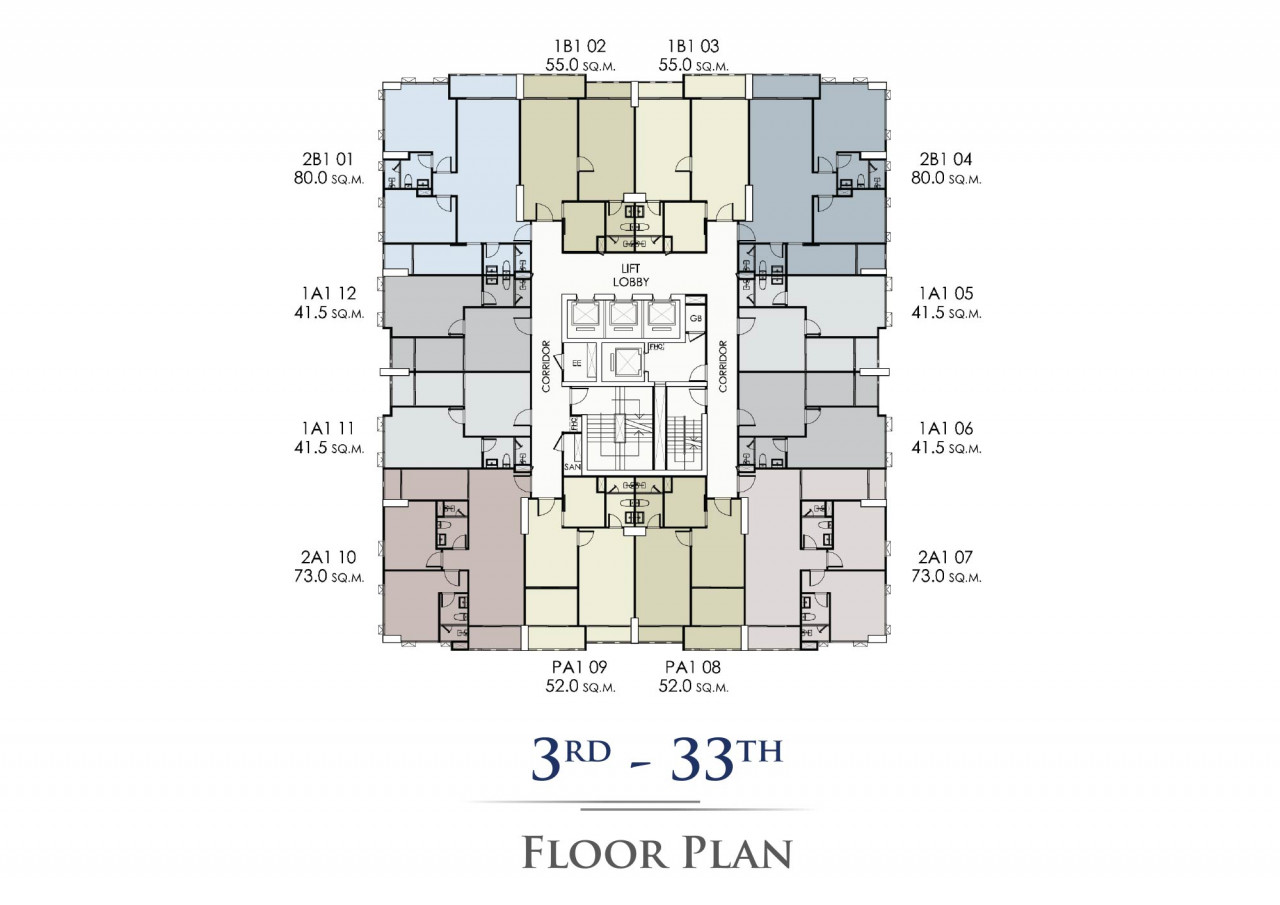 สำหรับพื้นที่พักอาศัยจะเริ่มต้นตั้งแต่ชั้น 3 เป็นต้นไป โดยชั้น 3 ไปจนถึงชั้น 33 จะมีห้องพักอาศัยต่อชั้นเพียง 12 ยูนิต ดังนี้…