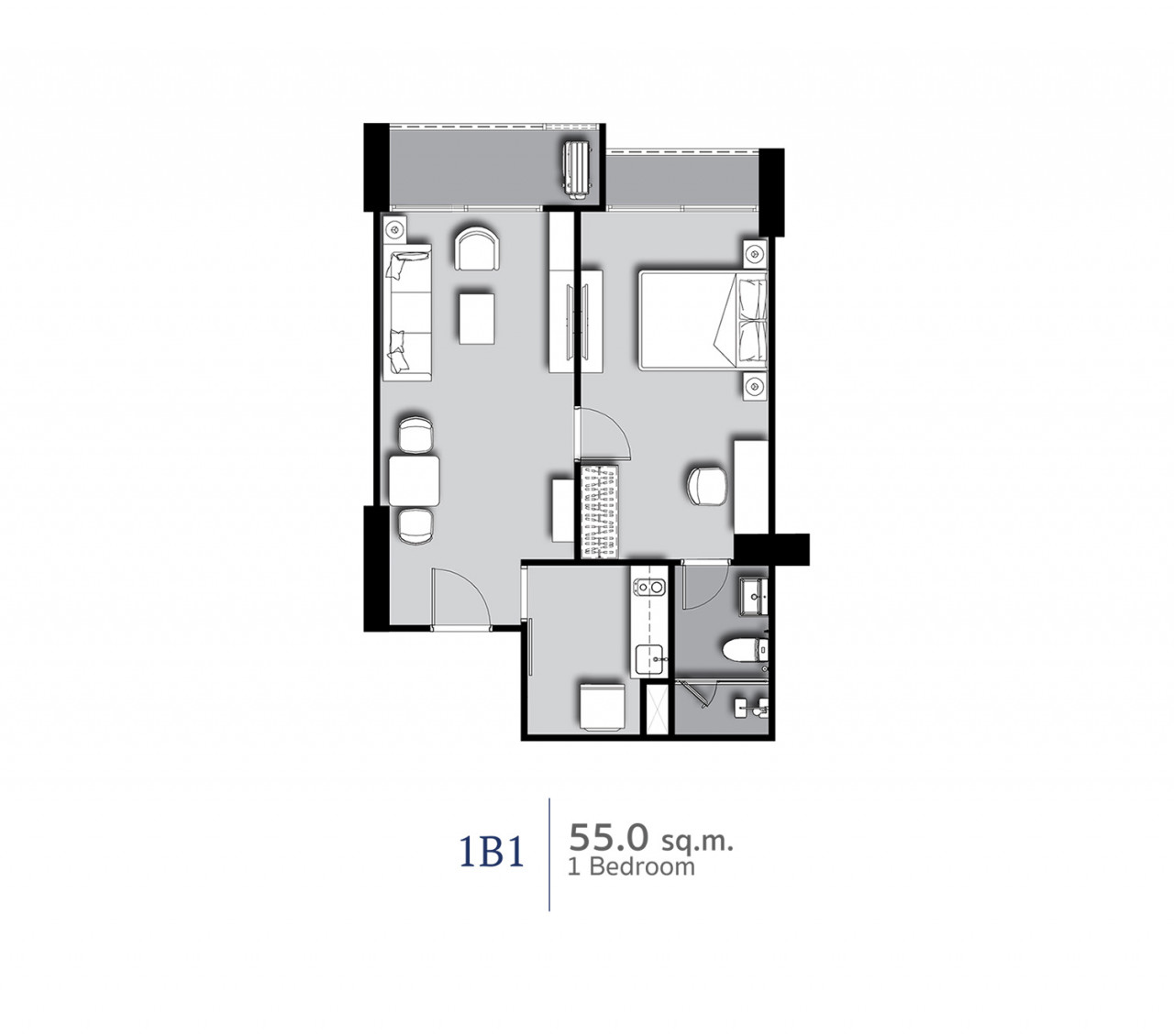 ห้อง 1 Bedroom ขนาด 55 ตร.ม. ตกแต่งมาในแบบ Fully Fitted โดยมีแปลนห้องเป็นลักษณะตอนลึก บริเวณทางเข้าจะดรอปพื้นที่เข้าไปเล็กน้อย ให้เสมอกันกับประตูห้องครัว และเมื่อเปิดประตูเข้าไป ทางด้านขวามือของทางเข้าก็จะเป็น ‘ส่วนครัวปิด’ ถัดไปจะเป็น ‘พื้นที่ Living room’ อยู่ติดกับระเบียงห้อง ส่วนด้านขวามือเชื่อมกับ Living room จะเป็น ‘Master Bedroom’ ที่ภายในจะมีระเบียง และห้องน้ำในตัวให้