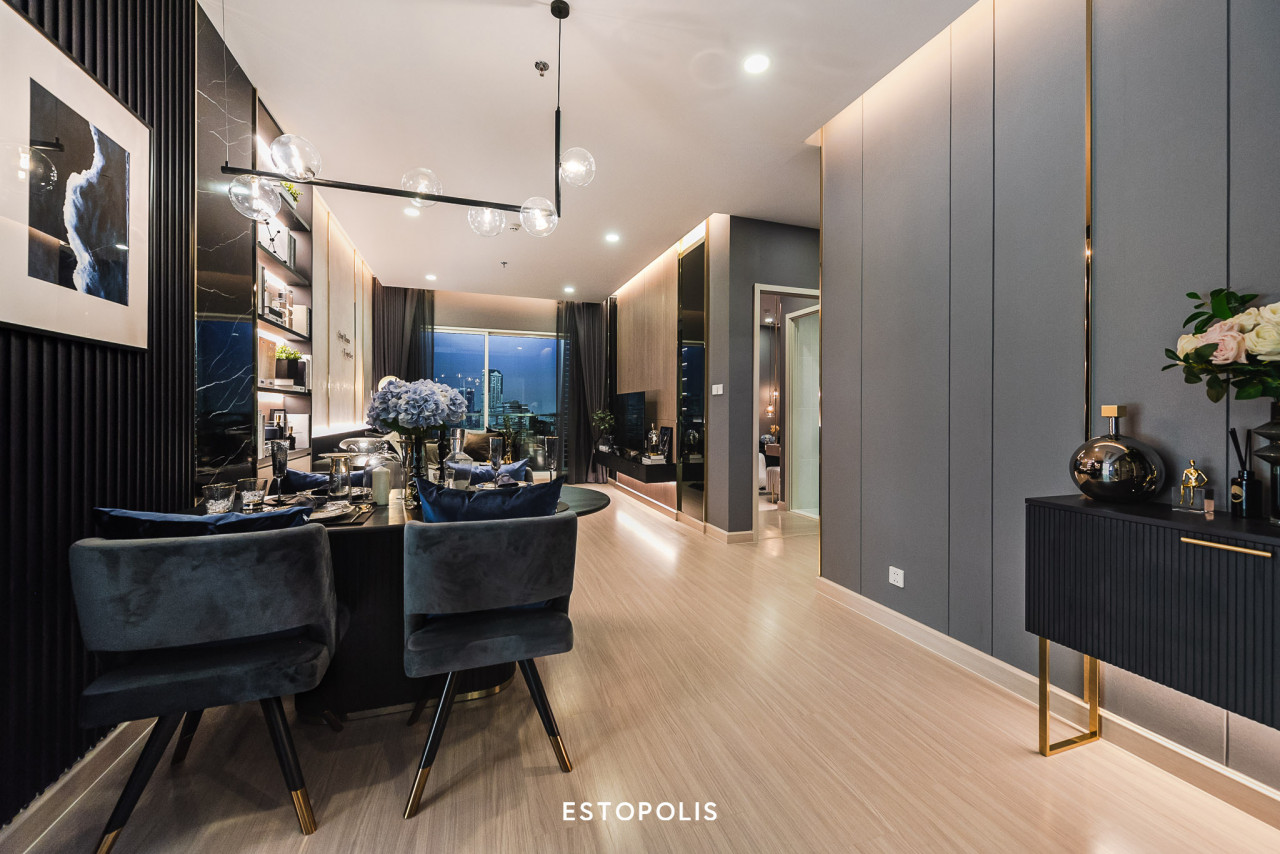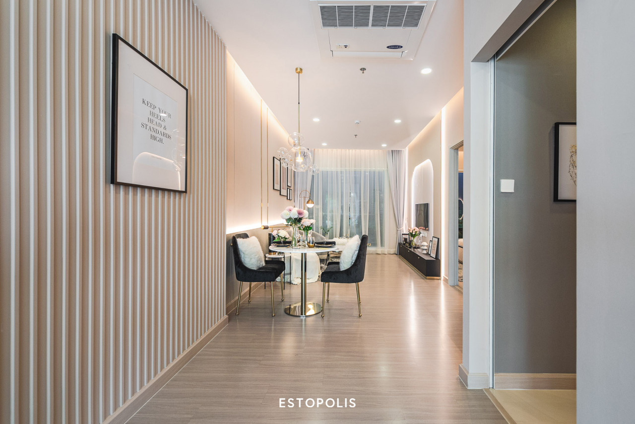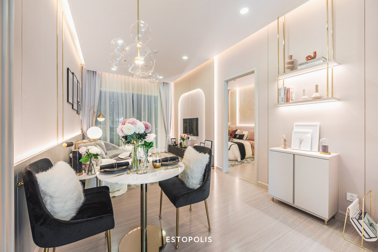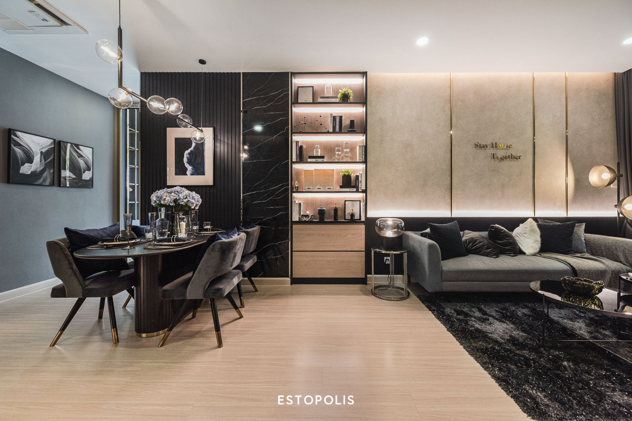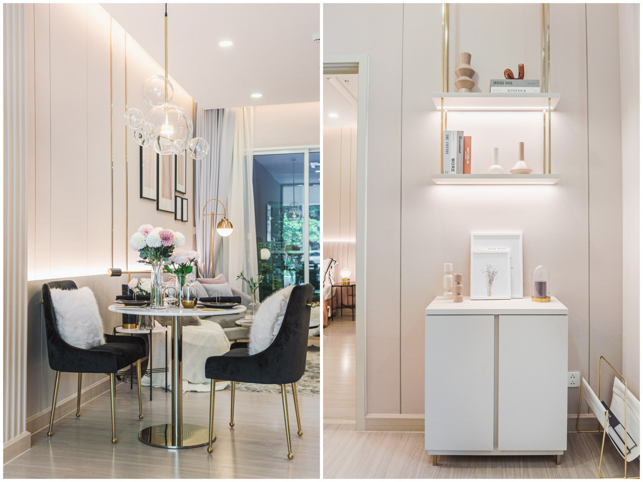 เริ่มต้นด้วย ‘มุมนั่งรับประทานอาหาร’ ที่เราสามารถเลือกวางโต๊ะทานอาหารให้เหมาะสมกับจำนวนสมาชิกครอบครัวได้ หรือใครที่ต้องต้อนรับแขกอยู่เป็นประจำ พื้นที่ Living room ก็ใหญ่พอที่จะรองรับโต๊ะตัวยาว 4-6 คนได้