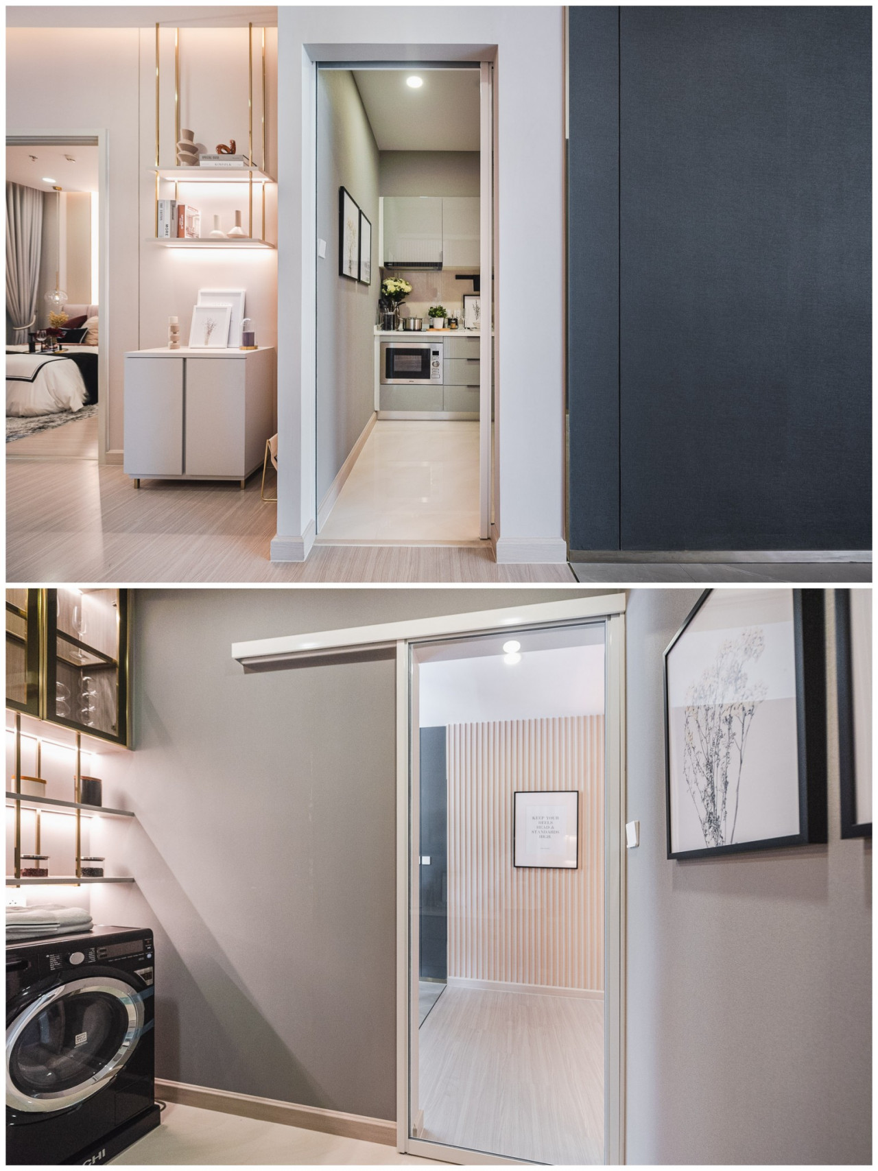 โดยในส่วนของ “ห้องครัวปิด” จะกั้นพื้นที่ออกจากส่วน Living room ด้วยประตูกระจกบานสไลด์ เพื่อป้องกันไม่ให้กลิ่นของอาหารเล็ดลอดออกไปรบกวนพื้นที่พักผ่อนของเราได้
