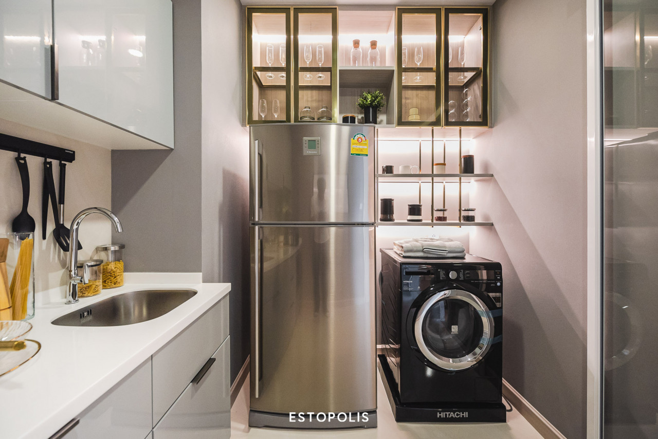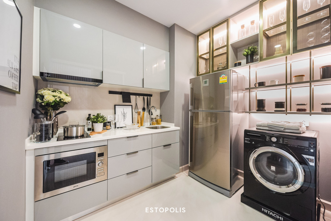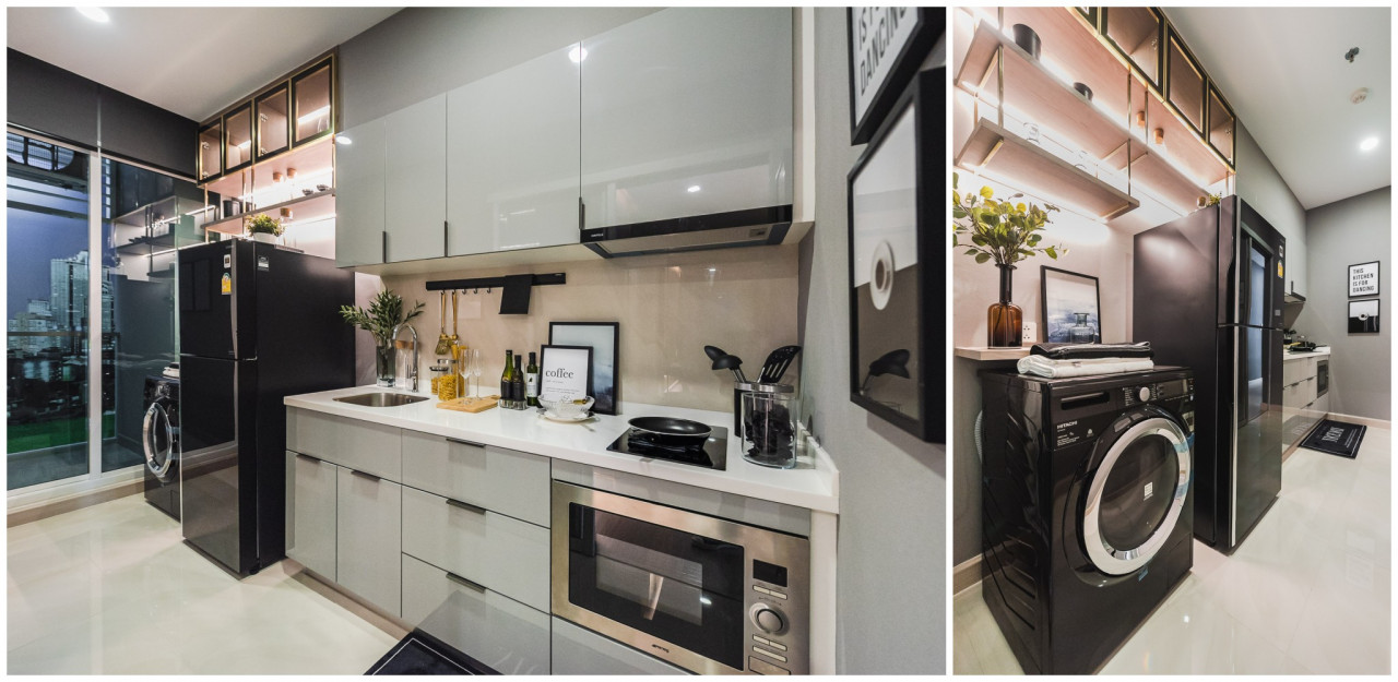 “ห้องครัว” มีลักษณะเปิดโล่งแบบหน้ากว้าง โดยเคาน์เตอร์ครัว, ชุดครัว และเครื่องใช้ไฟฟ้าต่าง ๆ นั้นก็จะใช้วัสดุ และแบรนด์เดียวกันกับห้อง 1 Bedroom ทุกประการ เพียงแต่มีขนาดที่ใหญ่กว่า เพื่อรองรับสมาชิกในครอบครัวที่มากขึ้น ถัดไปจะเป็นพื้นที่วางตู้เย็น และเครื่องซักผ้า ซึ่งทางโครงการก็ได้ติดตั้งระบบน้ำสำหรับการใช้งานเครื่องซักผ้าเอาไว้ให้เรียบร้อยแล้ว