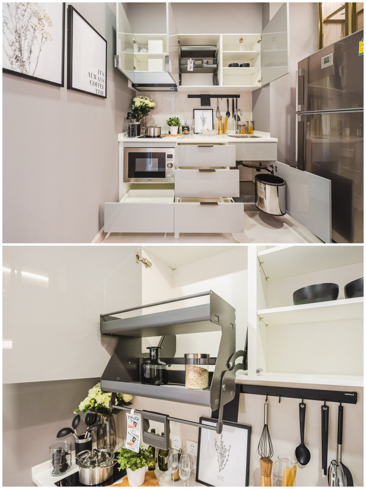 - นอกจากนี้ ยังเป็น Smart Kitchen ที่ช่วยให้ชีวิตง่ายขึ้นด้วยระบบชั้นรุ่น iMove จาก Hafele สามารถแบ่งพื้นที่การจัดเก็บ และใช้งานด้วยการดึง เพื่อให้การหยิบของจากที่สูงตามช่องต่าง ๆ ในตู้ลอยทำได้ง่ายขึ้น