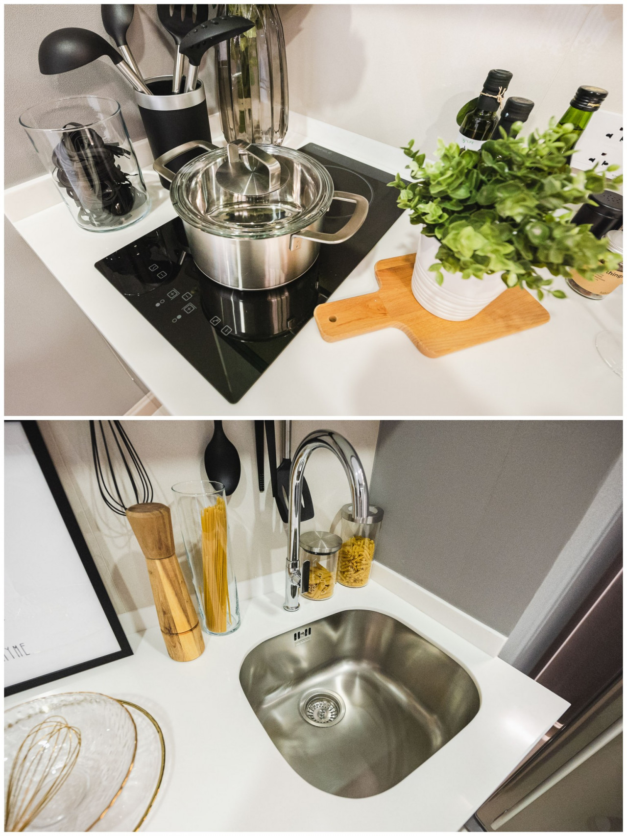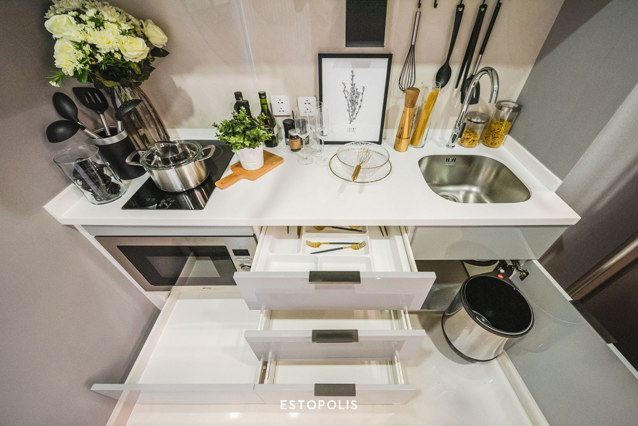 Top เคาน์เตอร์ครัวทำจากเรซิ่นสังเคราะห์สีขาว สะอาดตา พร้อมทำ backsplash ที่ช่วยให้การดูแลทำความสะอาดคราบต่าง ๆ นั้นเป็นเรื่องง่าย ส่วนผนังก็จะติดตั้งปลั๊กไฟมาให้ รองรับการใช้งานเครื่องใช้ไฟฟ้า ไม่ว่าจะเป็นเครื่องปั่น, เครื่องปิ้งขนมปัง, เตาอบแซนวิช, หม้อทอดไร้น้ำมัน ฯลฯ พร้อมเว้นช่องสำหรับใส่เตาอบเอาไว้ทางด้านล่าง ตลอดจนลิ้นชักบนสุดที่จัดช่องสำหรับเก็บช้อนส้อม