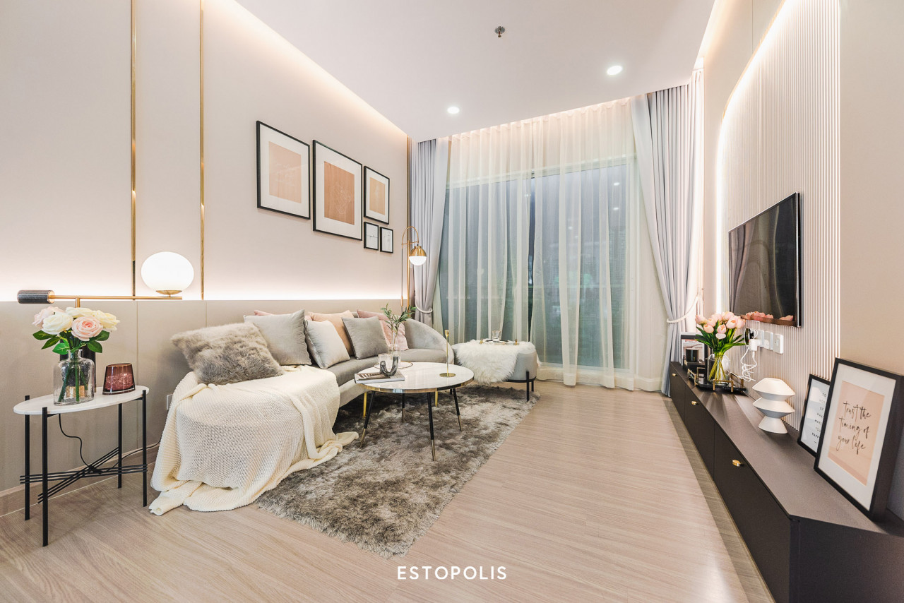 ไปสำรวจ “Living room” ของห้องกันต่อ โดยส่วนนี้จะมีขนาดค่อนข้างกว้างขวางมาก เราจึงสามารถแบ่งสัดส่วนการใช้งานให้เหมาะกับไลฟ์สไตล์ของเราได้อย่างอิสระ