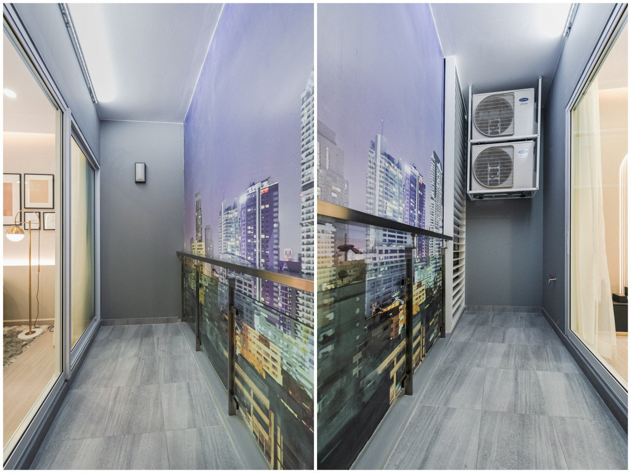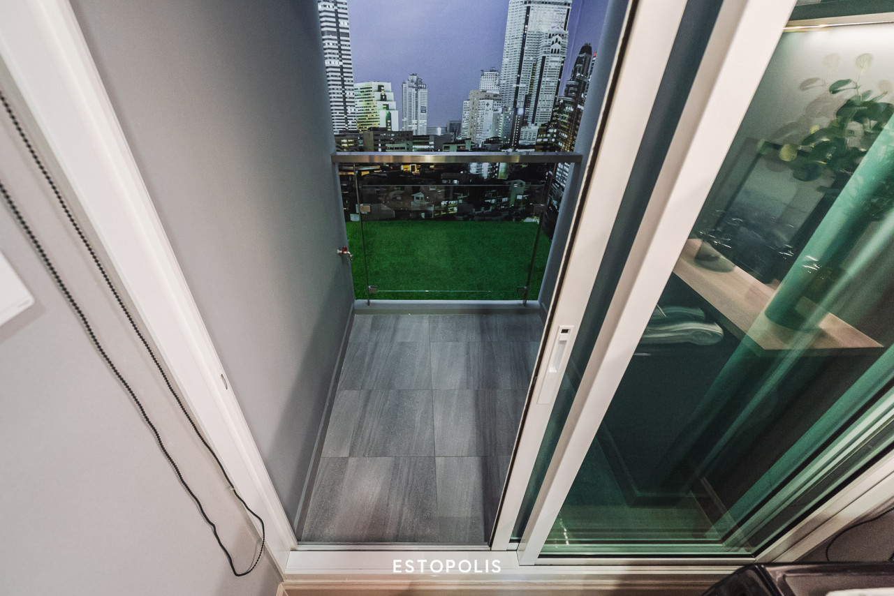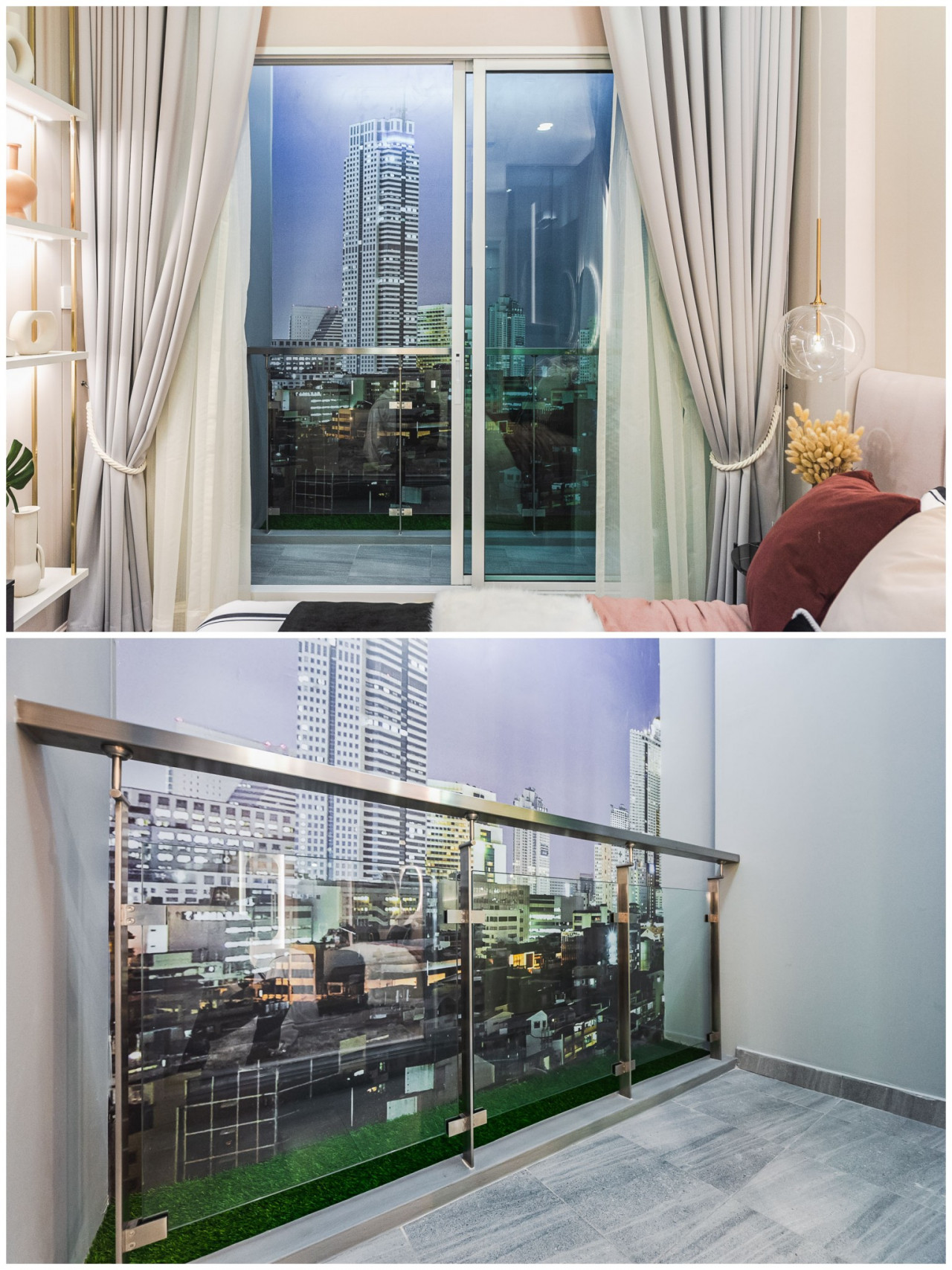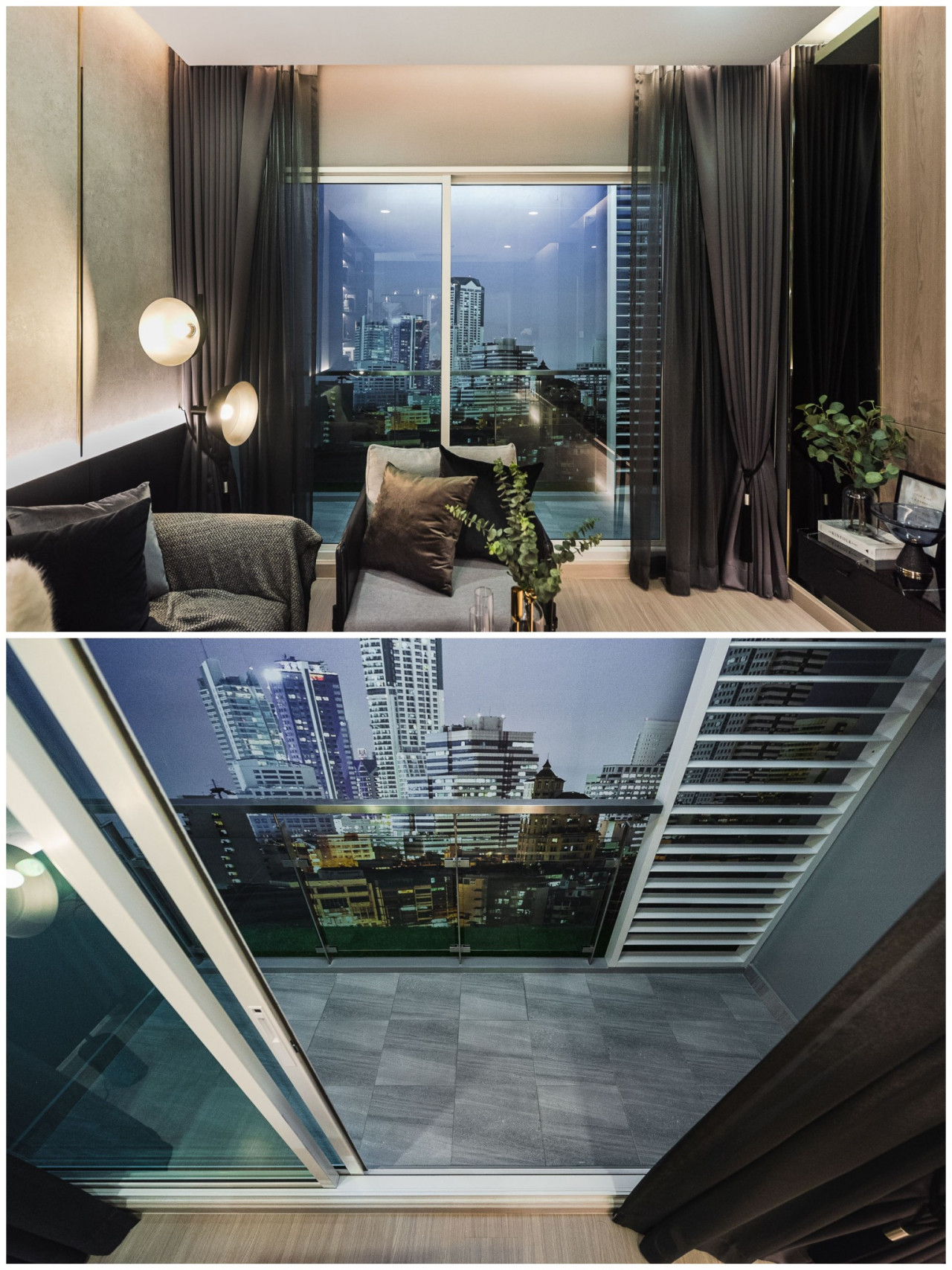 “ระเบียงห้อง” อยู่ติดกับมุมนั่งเล่น ซึ่งในเวลากลางวันจะได้แสงธรรมชาติส่องเข้ามาในห้องได้เต็มที่ ผ่านทางประตูกระจกบานสไลด์ โดยเราไม่จำเป็นต้องเปิดไฟในห้องเลย ส่วนช่วงเวลากลางคืนก็จะได้วิวเมืองที่สวยงาม และโรแมนติกเช่นกัน