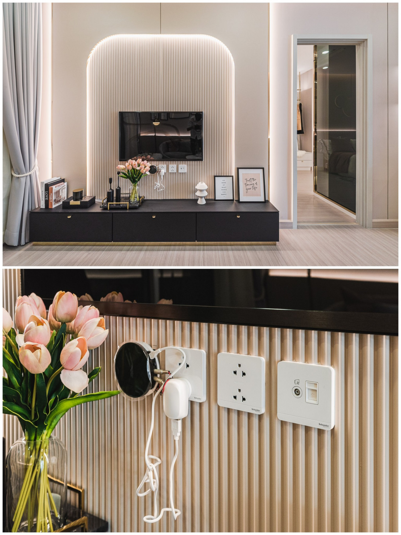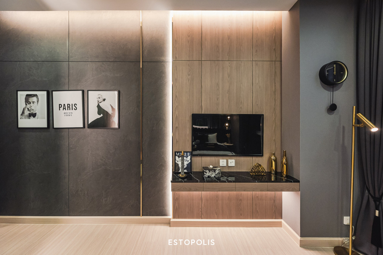 - ปลายเตียงมีปลั๊กไฟพร้อม Cable TV สำหรับติดตั้งทีวีมาให้เรียบร้อย ซึ่งเราอาจบิลต์อินชั้นวางทีวี เพื่อใช้เก็บของให้เป็นระเบียบ หรือจะออกแบบเป็นชั้นวางสำหรับตั้งโชว์ ก็สวยงามไปอีกแบบ