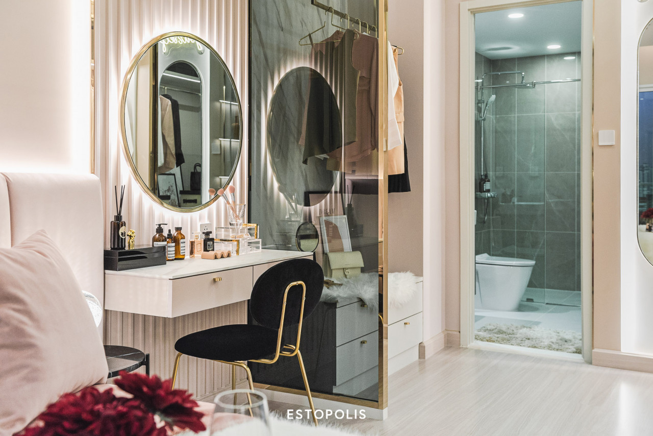 พื้นที่รอบเตียงมีพื้นที่ค่อนข้างมาก สามารถใช้ชีวิตได้อย่างคล่องตัว และเพียงพอให้เราวางโต๊ะหัวเตียงไว้คู่กับตู้เสื้อผ้าขนาดใหญ่ และโต๊ะเครื่องแป้งได้โดยไม่อึดอัด