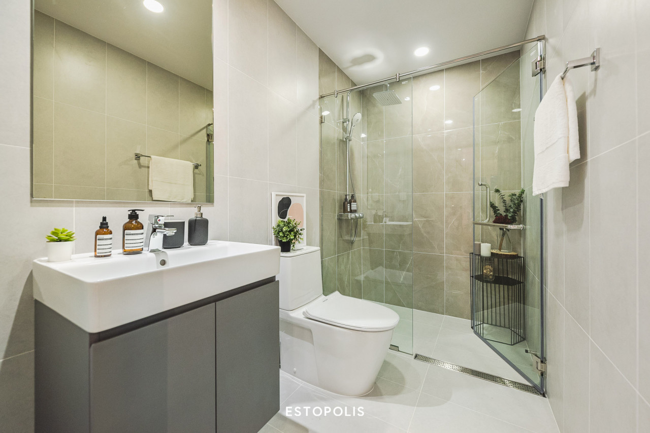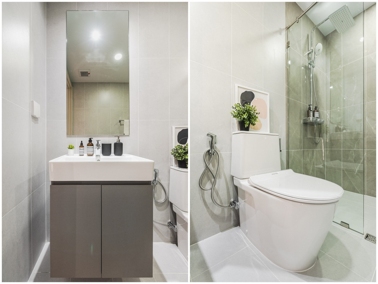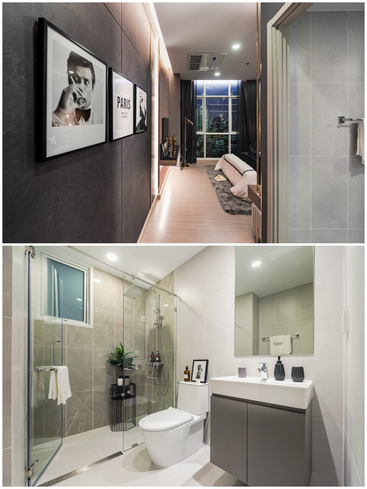 เมื่อเข้าไปใน “ห้องน้ำ” เราจะเจอกับเคาน์เตอร์อ่างล้างหน้า, โถสุขภัณฑ์ และมีราวแขวนผ้าขนหนูติดมาให้อยู่ฝั่งตรงข้าม ส่วนด้านในสุดจะเป็น Shower Box ที่กั้นแยกออกจากพื้นที่ใช้งานโซนแห้งด้วย Partition กระจกใสแบบนิรภัย