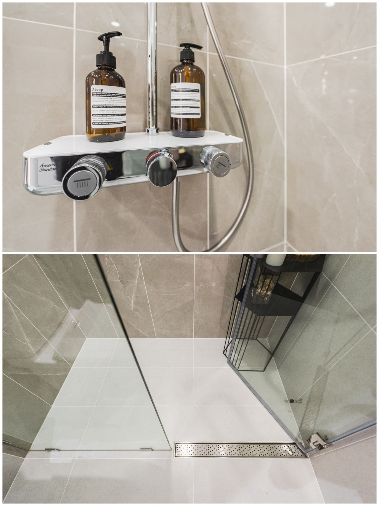 บริเวณตัวปรับระดับน้ำดีไซน์มาอย่างเรียบง่าย เพื่อตอบโจทย์การใช้งานจริง ให้เราสามารถใช้วางอุปกรณ์อาบน้ำได้ในตัว และยังสามารถต่อเติมชั้นวางของเพิ่มเติมแบบในห้องตัวอย่างได้ ส่วนรางระบายน้ำจะอยู่บริเวณใต้พาร์ติชัน เพื่อป้องกันไม่ให้น้ำไหลออกไปยังโซนแห้งได้