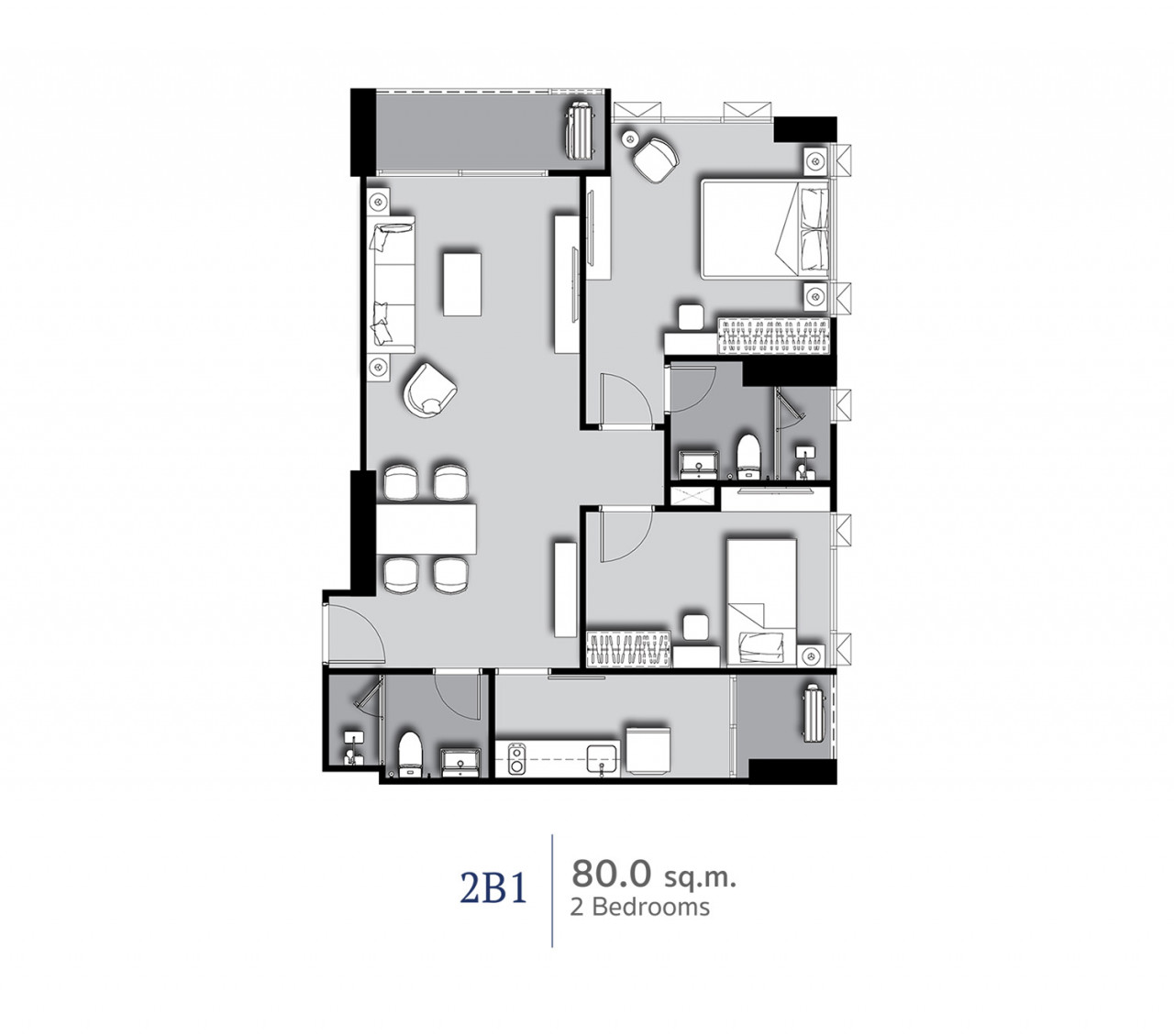 - 2 Bedrooms ขนาด 80 ตร.ม. : จำนวน 2 ห้อง