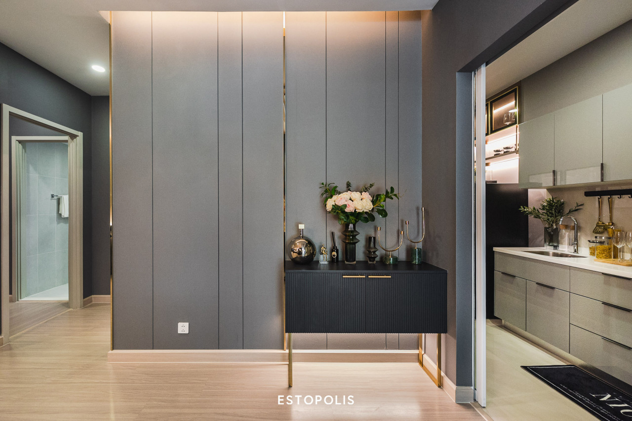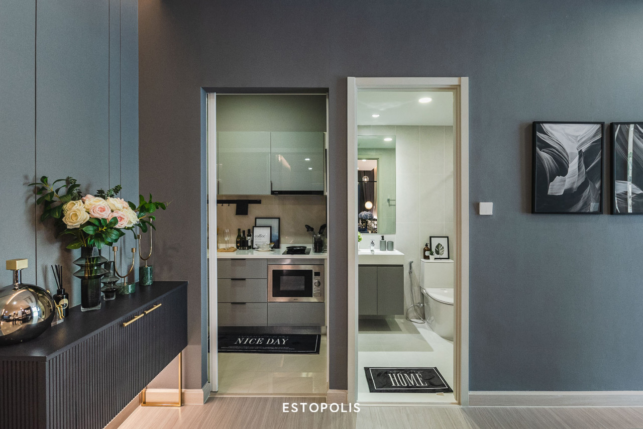 ส่วนขวามือทางเข้าจะเป็นส่วนของ ‘ห้องน้ำและครัวปิด’ ที่ตั้งอยู่ติดกัน ทำให้เห็นว่าห้อง 2 Bedroom ขนาด 80 ตร.ม. นี้ ได้มีการวางแปลน พร้อมแยกสัดส่วนการใช้งานไว้อย่างชัดเจน โดยให้ความสำคัญกับพื้นที่ห้องนอน และพื้นที่พักผ่อนอย่าง Living room เป็นพิเศษ แล้วค่อยจัดวางพื้นที่ในส่วนของการใช้งานอย่าง ‘ห้องครัวและห้องน้ำรับแขก’ ไปไว้ด้านหน้าทางเข้าแทน