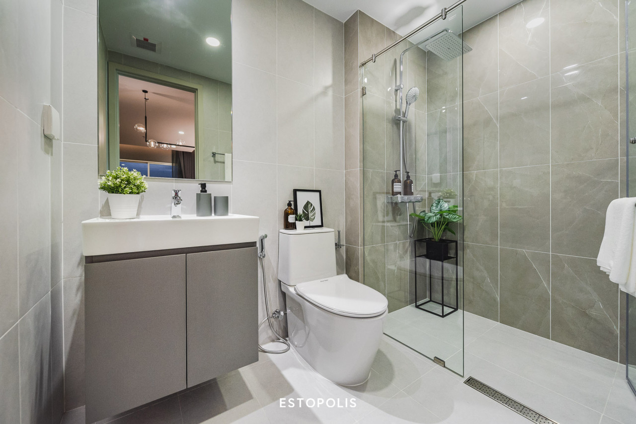 และแม้แต่ใน “ห้องน้ำรับแขก” เองก็จะได้ Shower box มาด้วย เราจึงสามารถใช้ห้องนี้ในยามเร่งรีบได้ทันที เหมาะสำหรับการอยู่อาศัย 2-3 คน ส่วนชุดสุขภัณฑ์และวัสดุภายในทั้งหมด จะเลือกใช้แบรนด์ American Standard เหมือนกับห้อง 1 Bedroom ทุกประการ