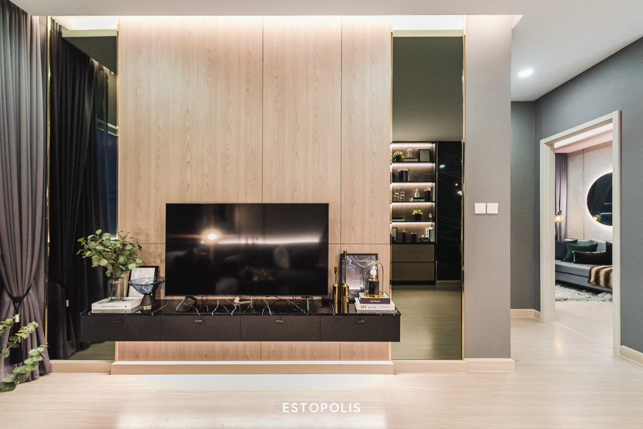 ขยับเข้าไปอีกเล็กน้อย ก็จะเป็นพื้นที่ที่เราสามารถตกแต่ง “ห้องนั่งเล่น” ได้อย่างอิสระ มีความกว้างเพียงพอให้วางชุดโซฟาขนาดใหญ่ พร้อมโต๊ะกลางได้แบบสบาย ๆ ทั้งยังเหลือระยะรับชมที่พอดีกับระดับสายตาอีกด้วย