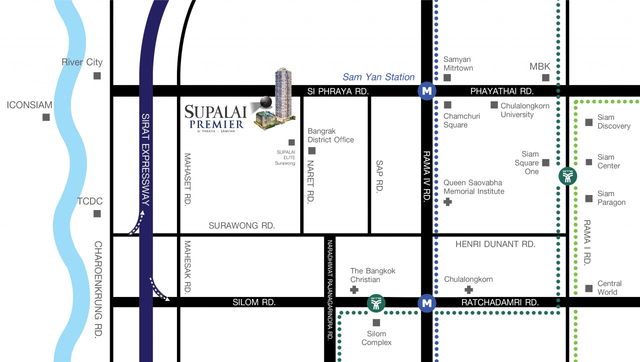 โครงการ Supalai Premier Si Phraya-Samyan ตั้งอยู่ใกล้แหล่งธุรกิจหลักใจกลางกรุงเทพฯ หรือ Central Business Districts-CBD Area ที่เป็นศูนย์กลางของอาคารสำนักงาน และสถานศึกษาชั้นนำ เพียบพร้อมด้วยสิ่งอำนวยความสะดวก บวกกับการเดินทางด้วยระบบขนส่งสาธารณะที่สะดวกสบาย