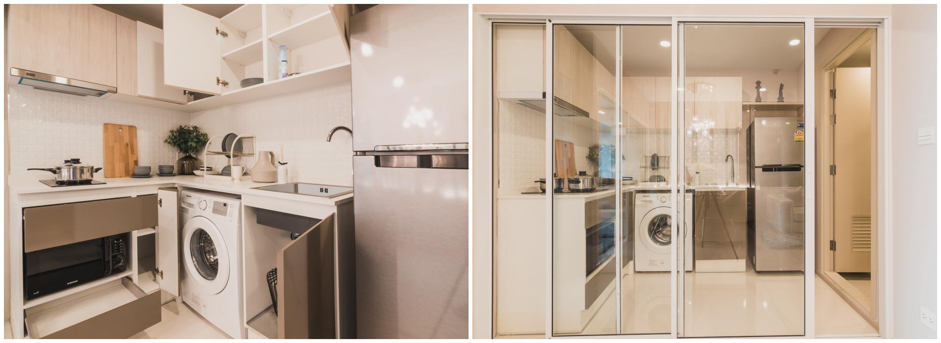 ที่สำคัญ ห้องครัวของ The Tree สุขุมวิท 64 จะกั้นพาร์ติชั่นแบบบานเลื่อน 3 ตอน เปิดออกได้กว้าง ซึ่งจะช่วยให้บรรยาากาศในห้องยังดูสดใส ไม่ถูกกลิ่นและควันรบกวน ส่วนเครื่องดูดควันก็สำคัญเช่นกัน เพราะได้แบบปล่อยออกนอกอาคาร จึงสามารถระบายอากาศได้ดีกว่า
