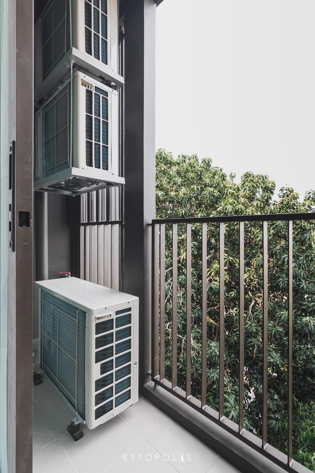 สำหรับระเบียง จะแขวนและตั้งคอมเพรสเซอร์แอร์ทั้ง 3 ตัวให้หันหน้าออกนอกอาคาร จึงหมดปัญหาเรื่องลมร้อนที่จะกระทบตัวห้อง