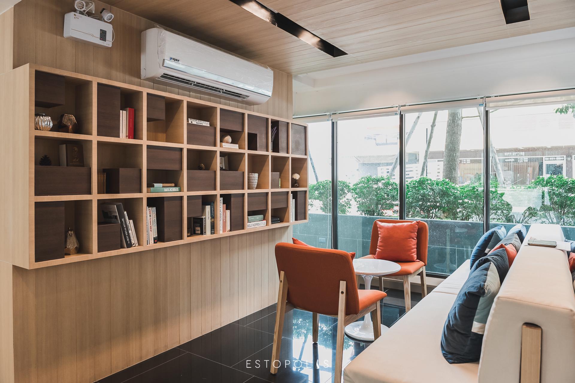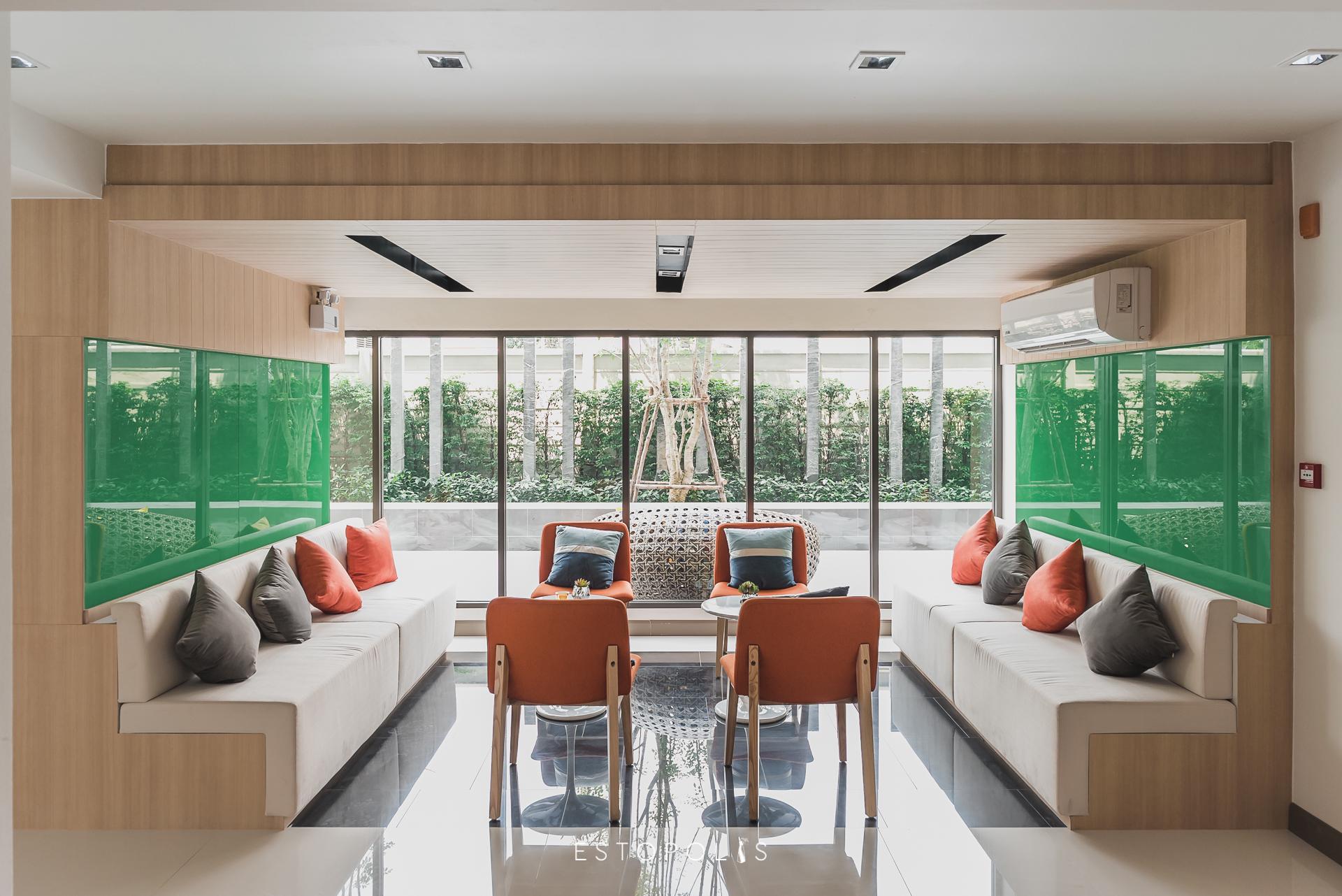 ส่วนอาคาร B จะมีล็อบบี้อยู่ใต้อาคาร พร้อมจัดวางที่นั่งให้พัก นั่งเล่นตากแอร์ชิลล์ๆ ได้ ด้วยบรรยากาศที่ปลอดโปร่ง มองเห็นพื้นที่สีเขียวริมอาคารผ่านกระจกใสบานสูง