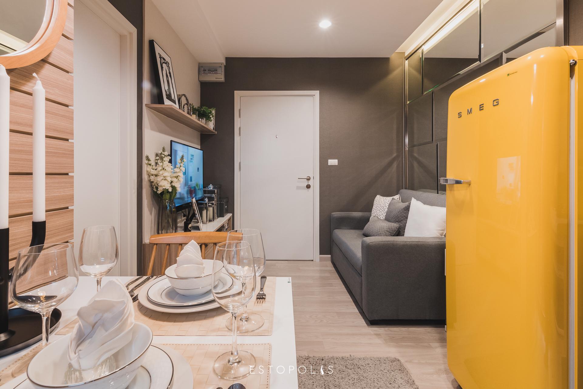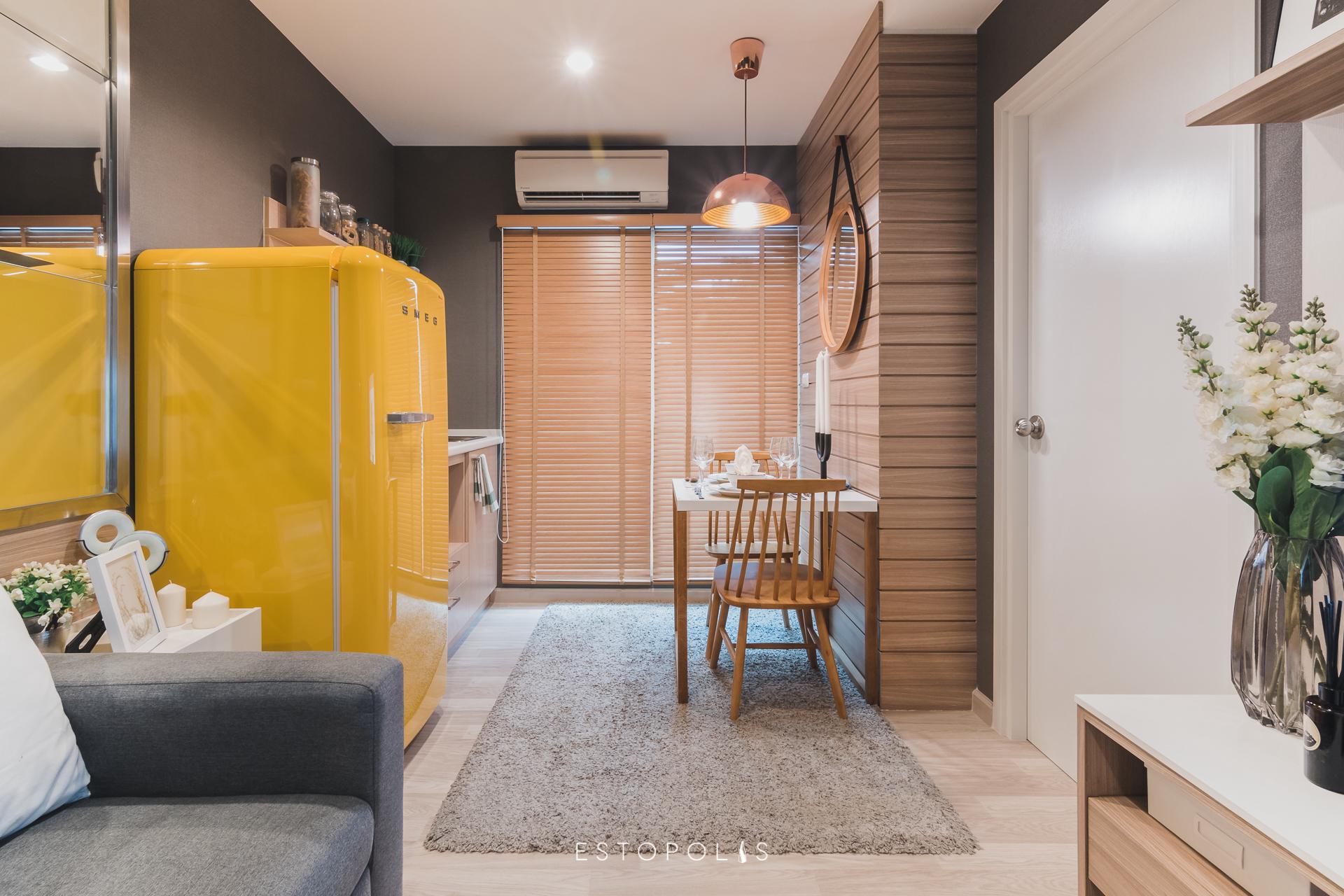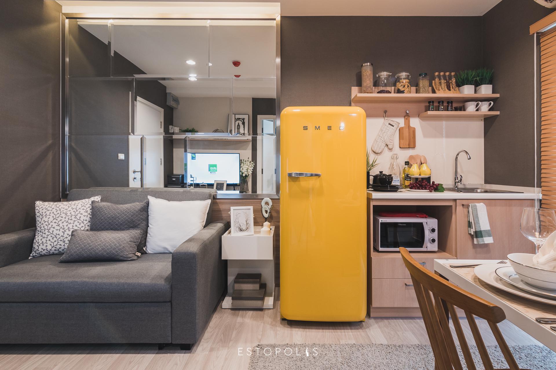 ระหว่างห้องครัวกับห้องรับแขก คั้นกลางด้วย ตู้เย็น ที่ทางโครงการ Plum Condo Chokchai 4 (พลัมคอนโด โชคชัย 4) นำมาตกแต่งไว้ ทำให้พื้นที่ส่วนนี้ดูเป็นสัดเป็นส่วนชัดเจน มีระเบียบและง่ายต่อการจัดการ