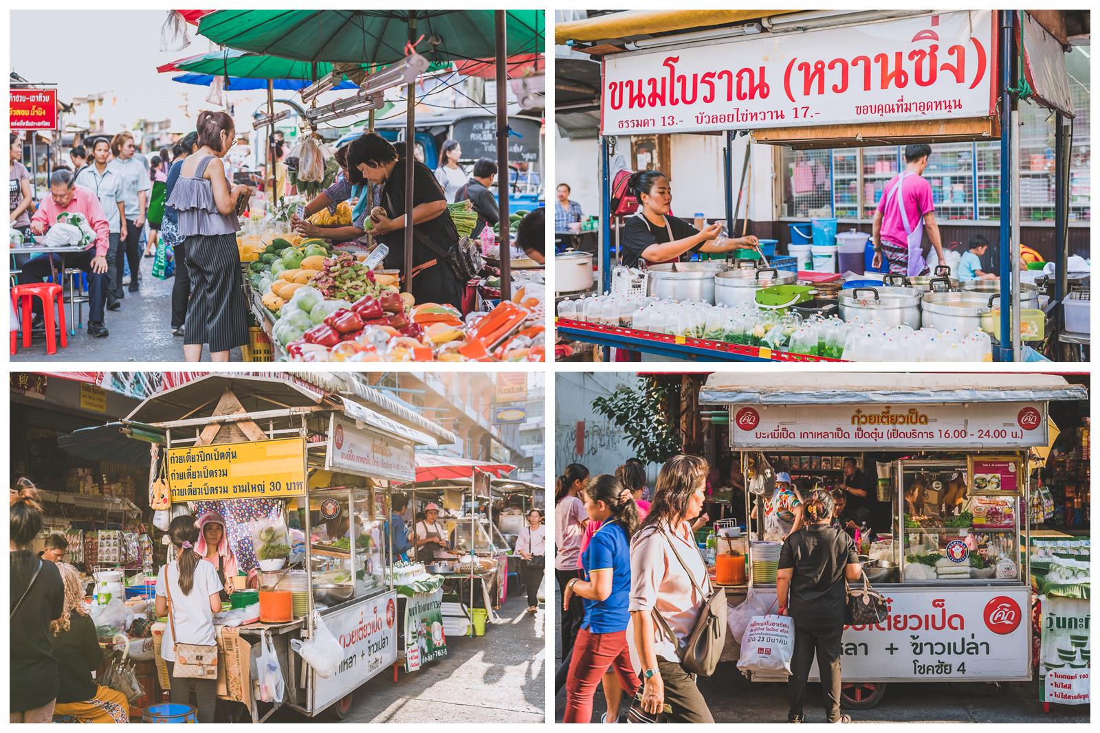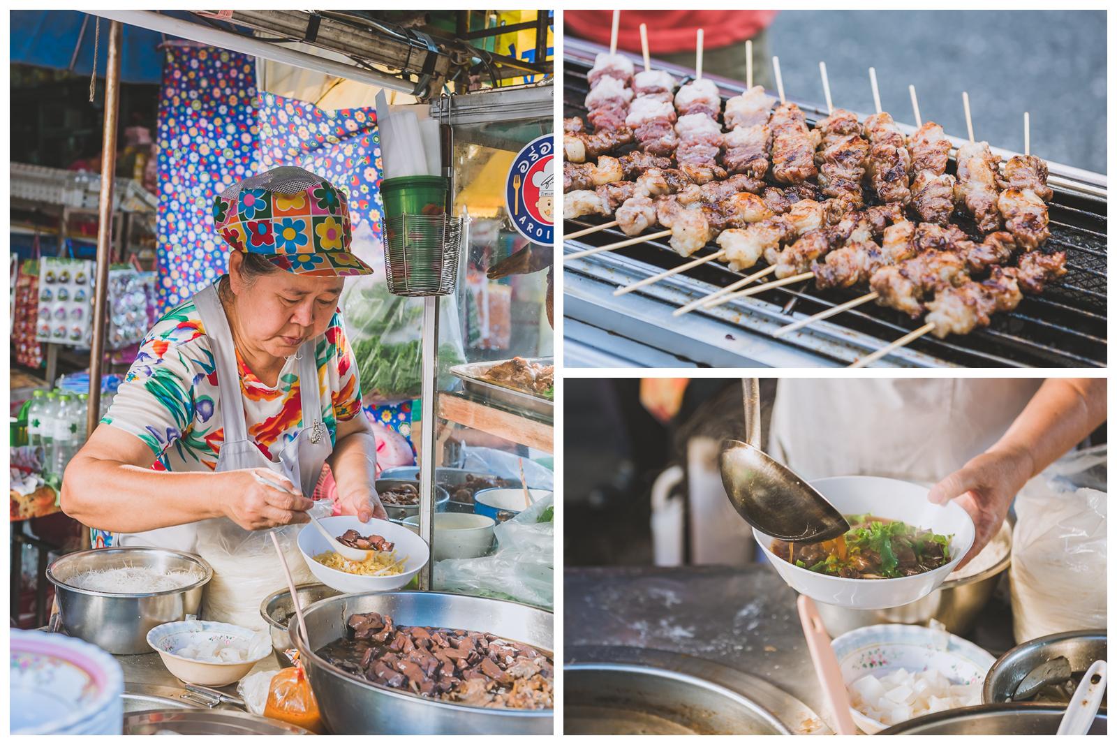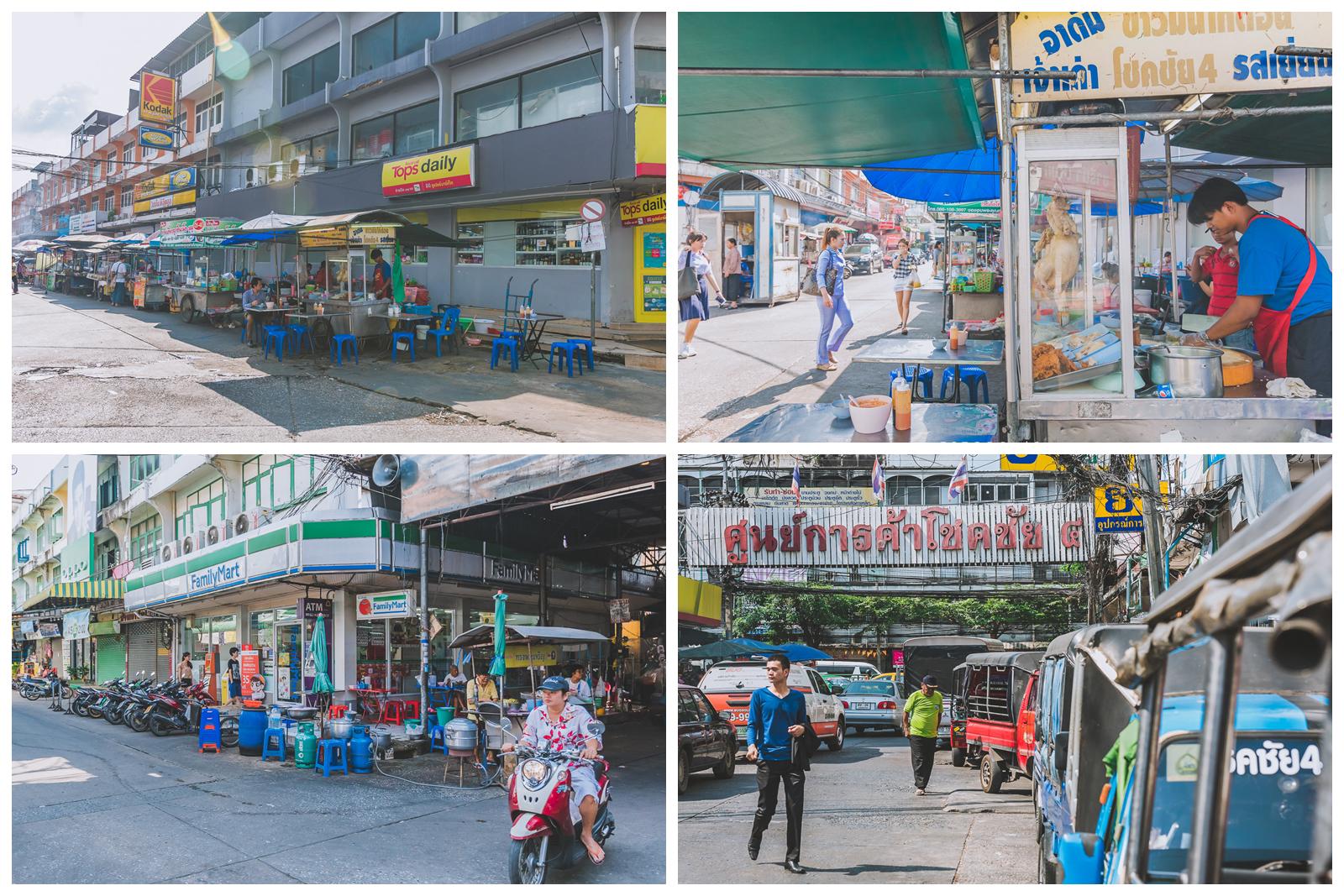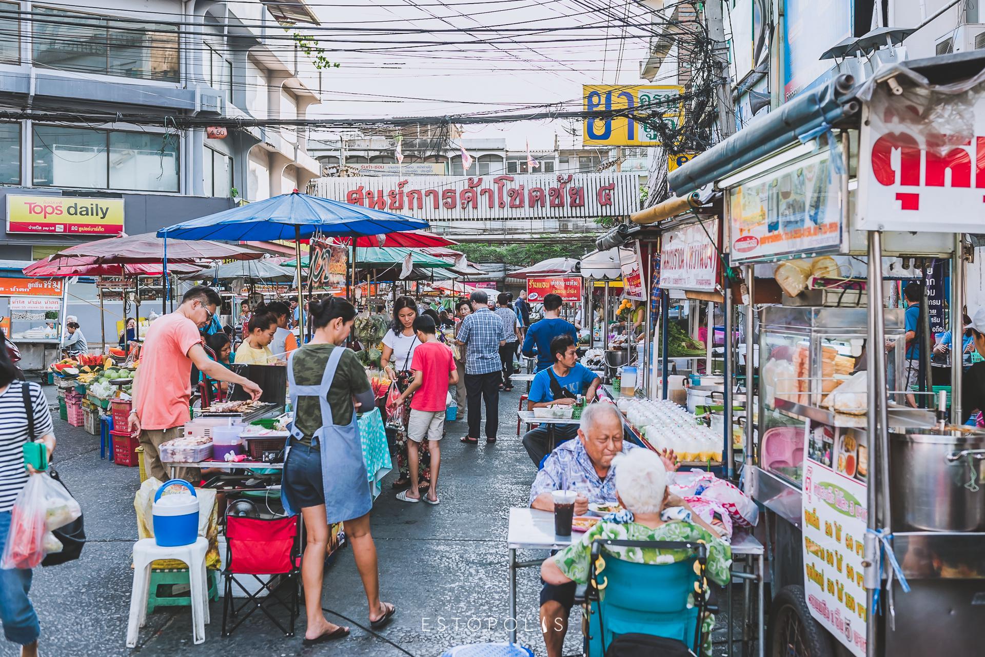 เริ่มที่ตลาดโชคชัย 4 ในช่วงเย็น ซึ่งจะมีร้านอาหารวางแผงขายกันคึกคักกว่าช่วงเช้า ทั้งผลไม้สด ของทานเล่น และอาหารจานหลัก