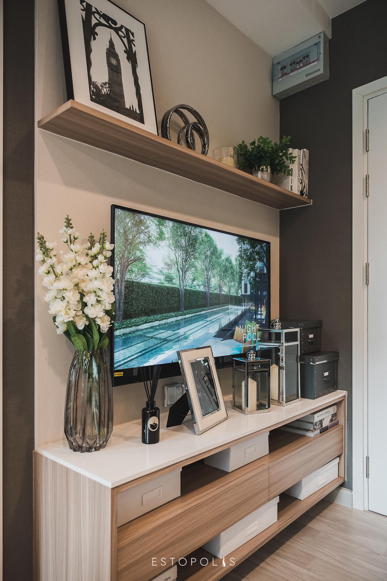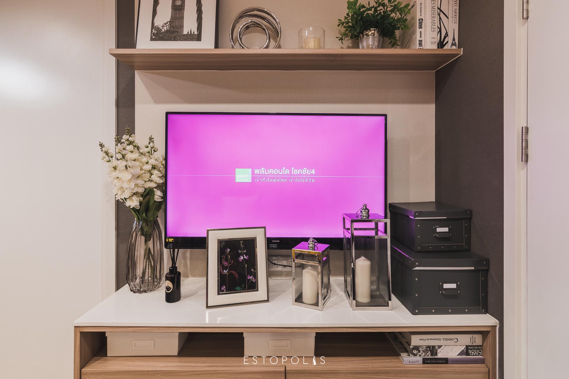 สำหรับชั้นวางโทรทัศน์ที่ทางโครงการ Plum Condo Chokchai 4 (พลัมคอนโด โชคชัย 4) บิลท์อินให้ดูเป็นไอเดีย จะช่วยประหยัดพื้นที่ภายในห้องได้เป็นอย่างดี เข้ากับสไตล์การแต่งห้องคอนโดที่เน้นฟังก์ชั่นการใช้งาน เพื่อให้ทุกส่วนของห้องดูสวยงามควบคู่ไปกับประโยชน์ใช้สอย