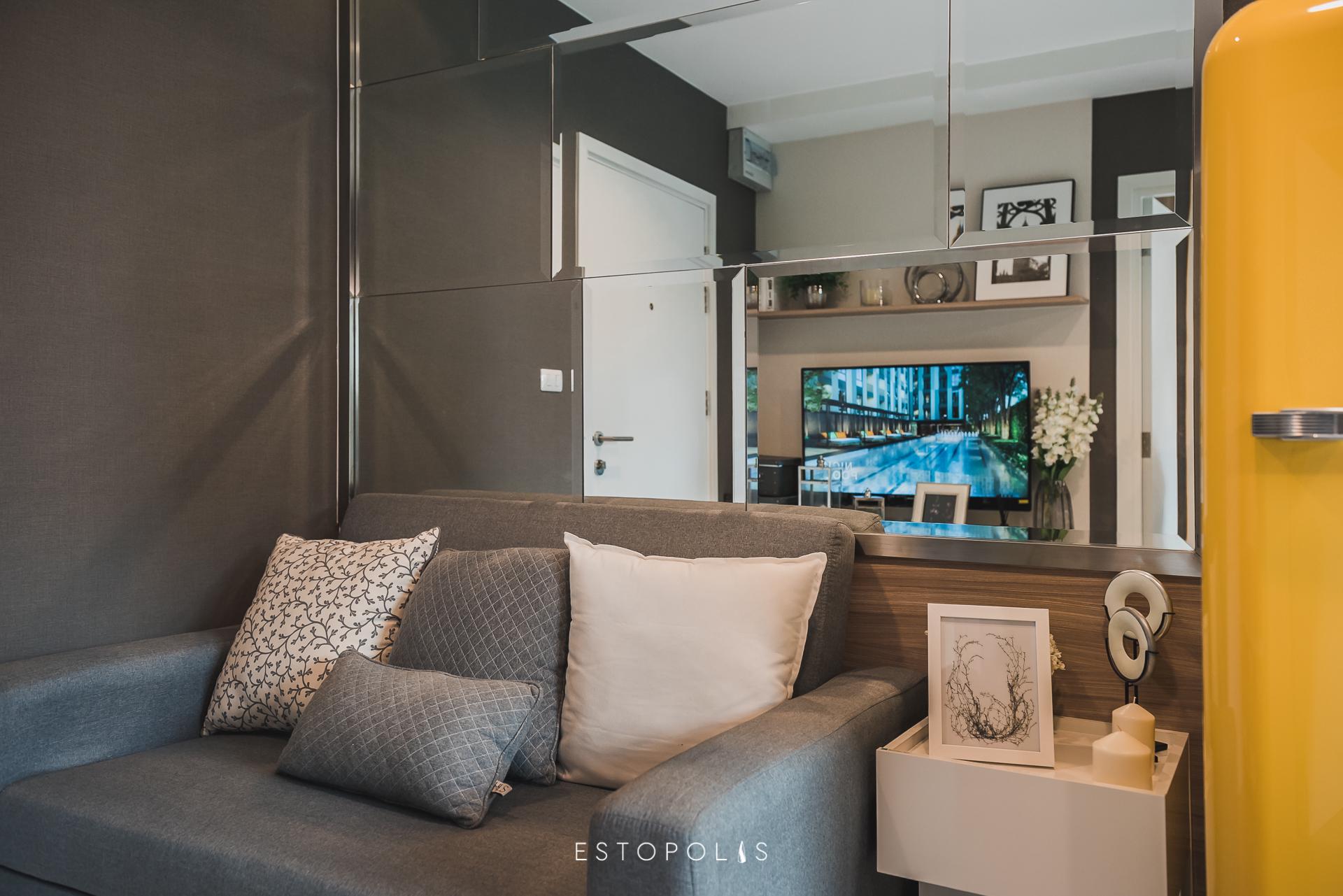 อีกหนึ่งเทคนิคแต่งห้องขนาดเล็กให้ดูกว้างขึ้นง่ายๆ คือ การกรุกระจกเพิ่ม เพื่อเสริมให้ห้องขนาด 24.50 ตารางเมตรดูมีมิติ ไม่อึดอัดสายตา
