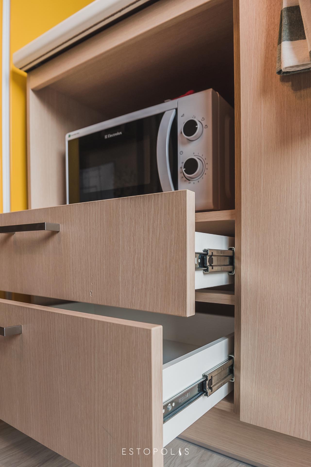 เคาน์เตอร์ครัวลามิเนตสีไม้อ่อน พร้อมลิ้นชักและช่องใส่ไมโครเวฟ ทำให้สะดวกและปลอดภัยเวลาหยิบยกจับของร้อน