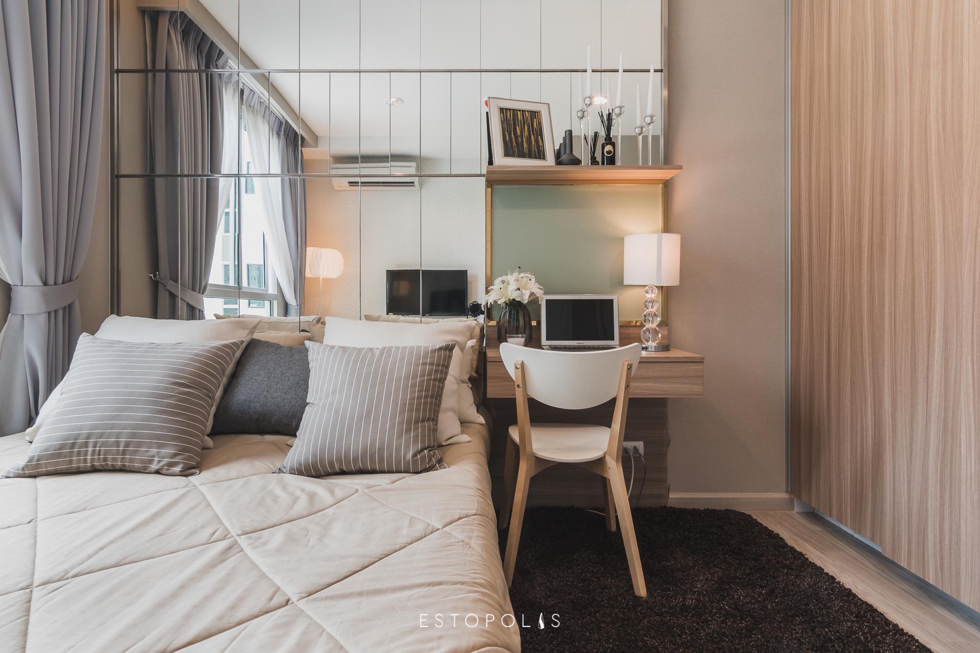ถ้าเราเลือกวางเตียงขนาดควีนไซส์อย่างในห้องตัวอย่าง ข้างเตียงจะเหลือพื้นที่ให้บิลท์อิน (Built in) มุมทำงานส่วนตัวได้ หรือหากใครอยากได้ที่นอนสบายๆ อาจขยับไปใช้เตียงคิงไซส์ 6 ฟุตแทน ขึ้นอยู่กับไลฟ์สไตล์การพักผ่อนของผู้อยู่