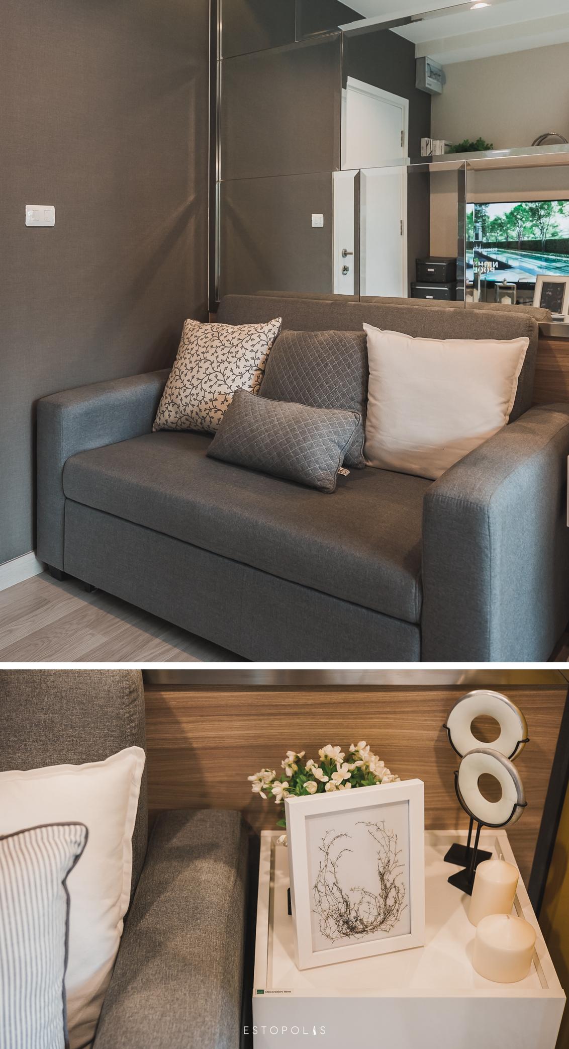 "มุมโซฟา" จะเป็นด่านแรกที่เอาไว้ต้อนรับการกลับมาของผู้พักอาศัย เหมาะสำหรับใช้ผ่อนคลายหรือพักเหนื่อยทันทีเมื่อมาถึงห้อง ส่วนใครที่ชอบนอนดูหนังฟังเพลงเป็นประจำ ก็สามารถขยับขยายโซฟาให้กว้างขึ้นได้เล็กน้อย อาจปรับเปลี่ยนไปใช้โซฟาแบบ Day Bed แล้วเลือกที่จะไม่วางโต๊ะข้างโซฟาแทน