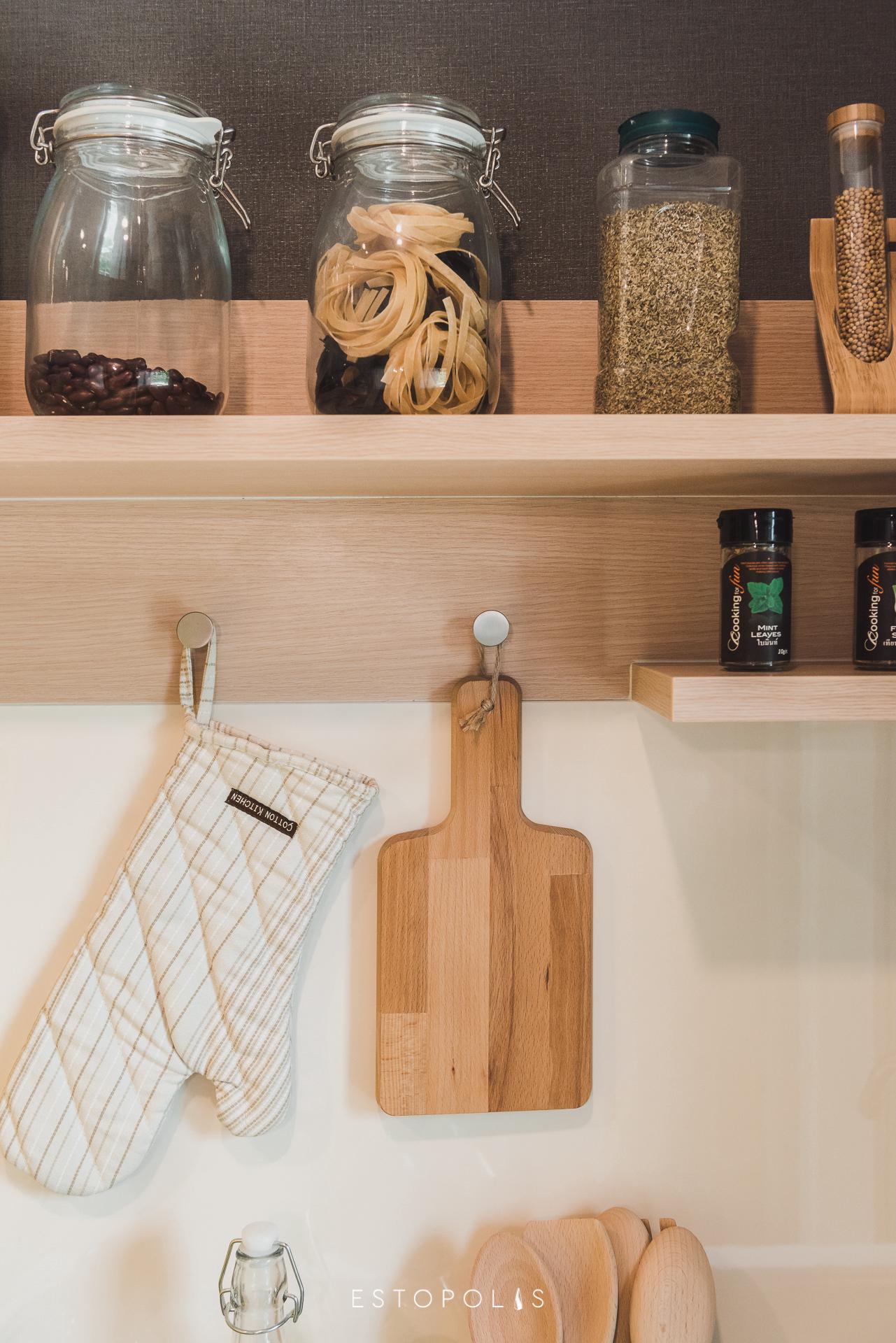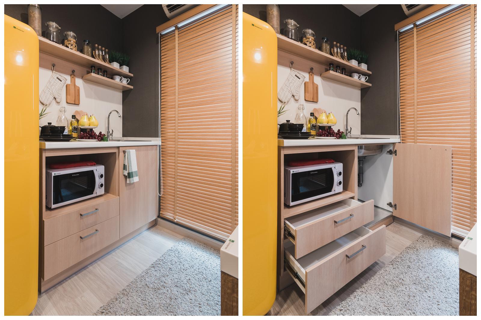 ชุดครัวบิลท์อินมาให้พร้อมๆ กับชั้นวางและเคาน์เตอร์สำหรับเก็บของ แบบ Soft Close ดูเรียบง่ายแต่สามารถใช้วางกระปุกเครื่องปรุง โหลเครื่องครัว รวมถึงจานชาม แก้วน้ำ ได้เยอะ หยิบจับก็สะดวก