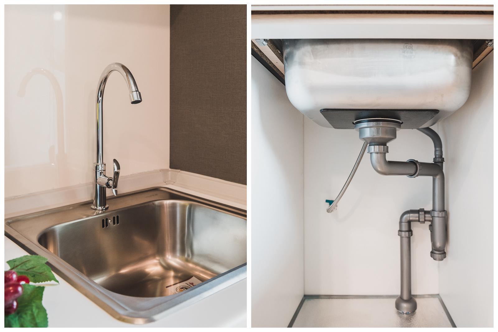 ท๊อปครัวเคลือบลามิเนตสีขาวสะอาดตา ซึ่งเราต้องหมั่นดูแลรักษาเป็นประจำ เพื่อป้องกันไม่ให้พื้นที่ครัวเกิดความชื้นหรือรอยเปื้อน ฝั่งขวาฝังซิงค์ล้างจานสแตนเลส ส่วนอีกฝั่งเว้นว่างไว้สำหรับงานจัดเตรียมอาหาร