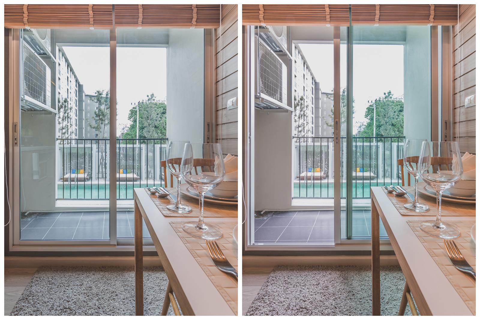 นอกจากนี้ ห้องครัว ยังเชื่อมกับ ระเบียง ซึ่งจะยิ่งช่วยให้การถ่ายเทอากาศภายในห้องนั้น รวดเร็วขึ้น โดยประตูระเบียงของโครงการ Plum Condo Chockchai 4 (พลัมคอนโด โชคชัย 4) จะเป็นบานเลื่อนสลับ ติดกระจกเขียวตัดแสง ผู้พักอาศัยสามารถแขวนผ้าม่านหรือมูลี่ เพื่อช่วยลดความร้อนที่จะเข้ามาในห้องได้