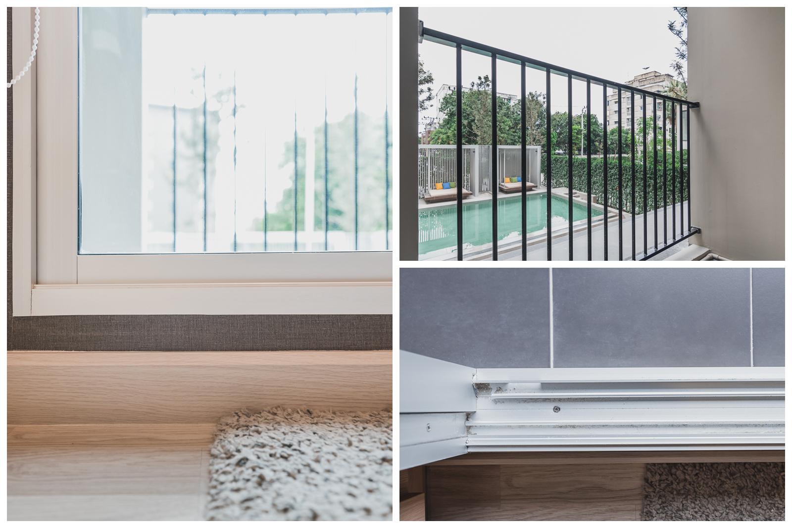 ระเบียงยกขอบสูงจากพื้นประมาณ 4 นิ้ว ปูกระเบื้องเซรามิก และติดตั้งราวกันตกแบบโครงเหล็กสูง 1 เมตรตามมาตรฐานความปลอดภัย